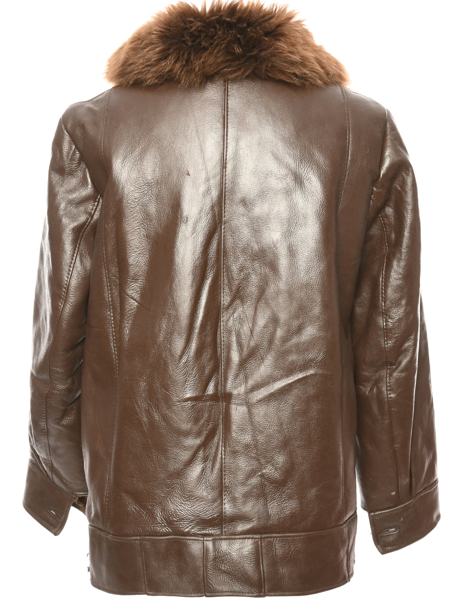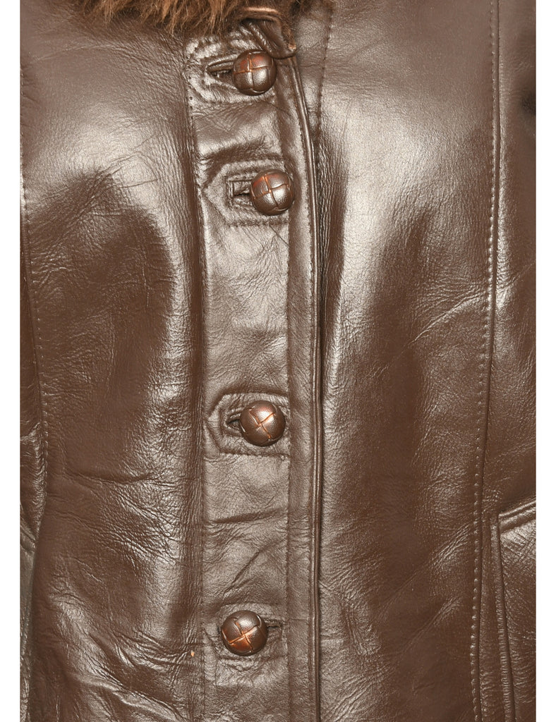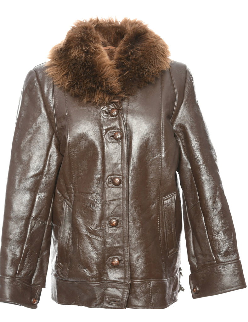 Single breasted parka comes in dark brown with a hood and fur trim.