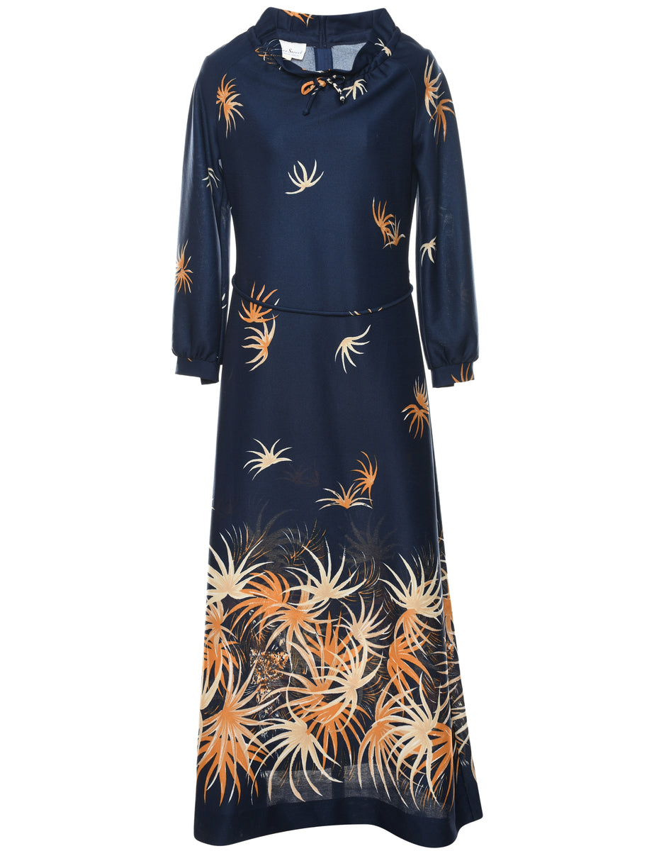 Long-sleeved navy & orange printed dress complete with a high neck. From the 1970s.