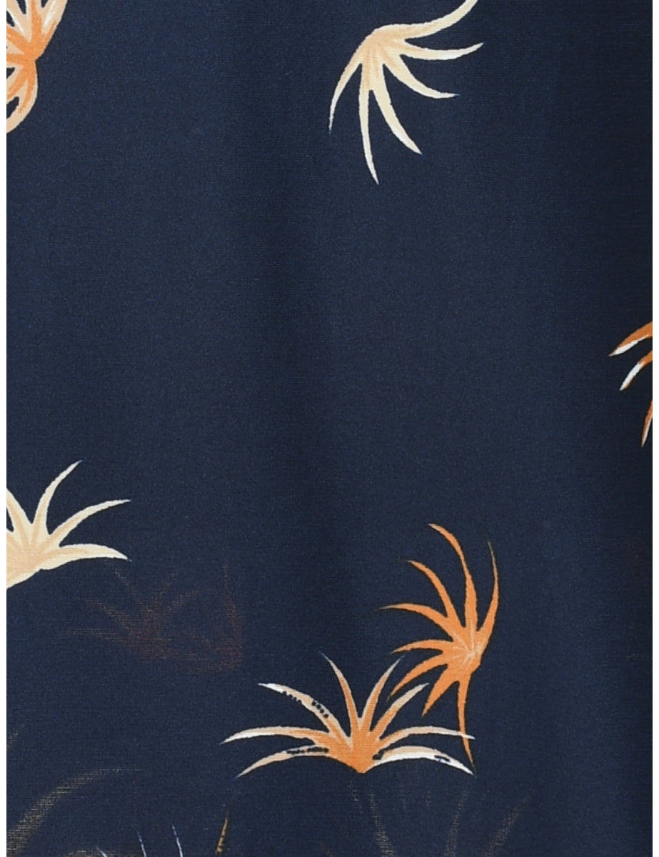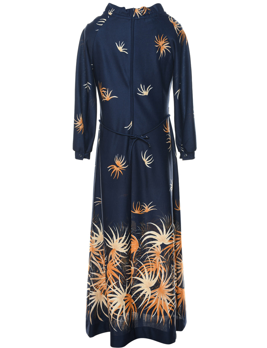 Vintage 1970s Orange & Navy Printed High Neck Dress - S