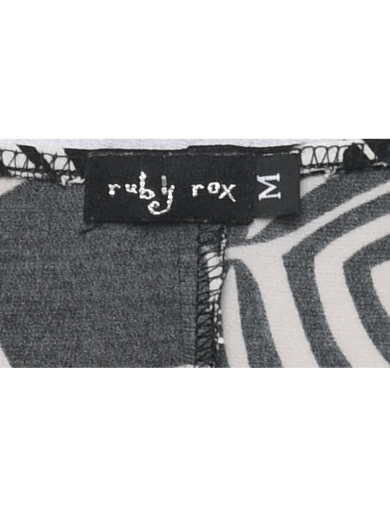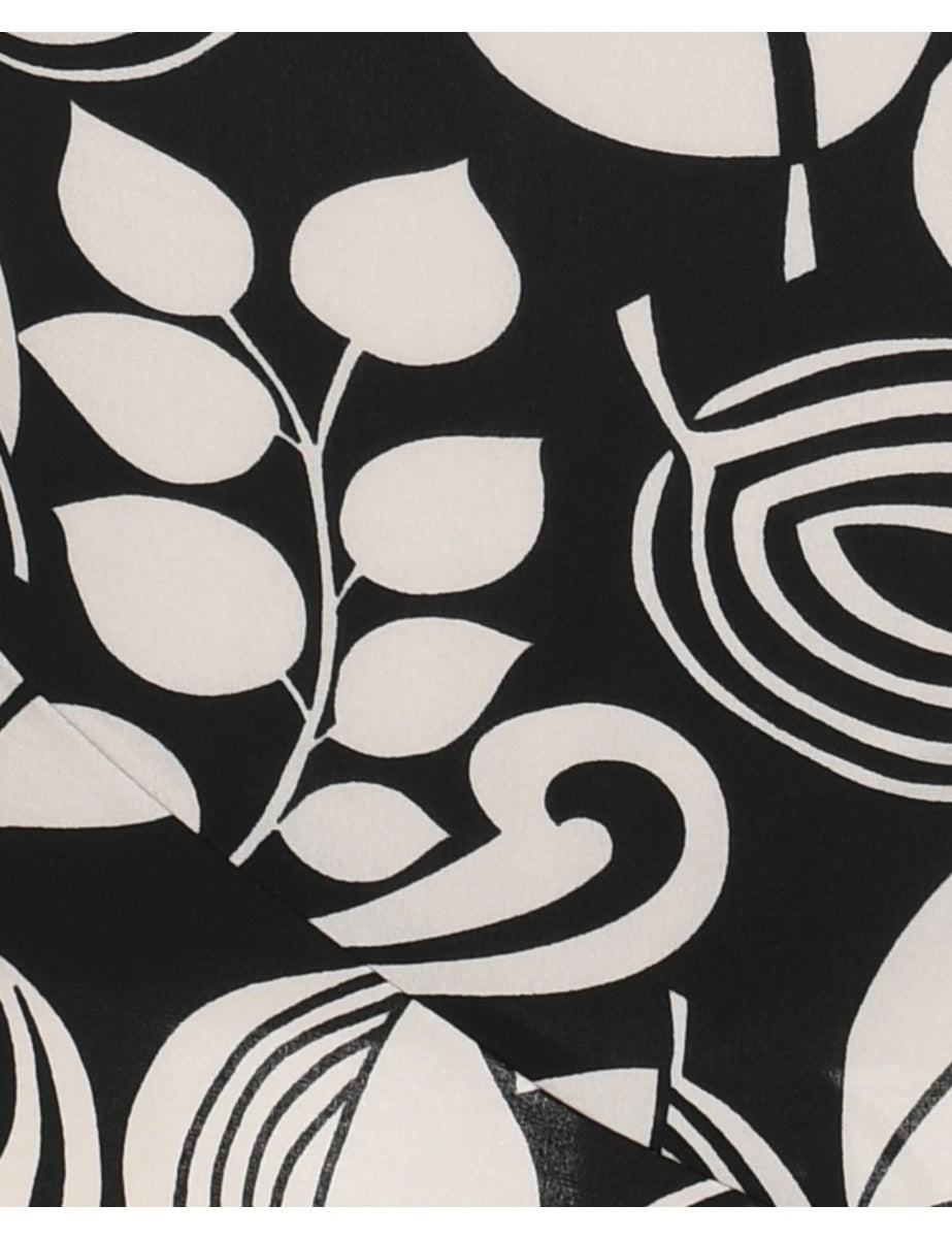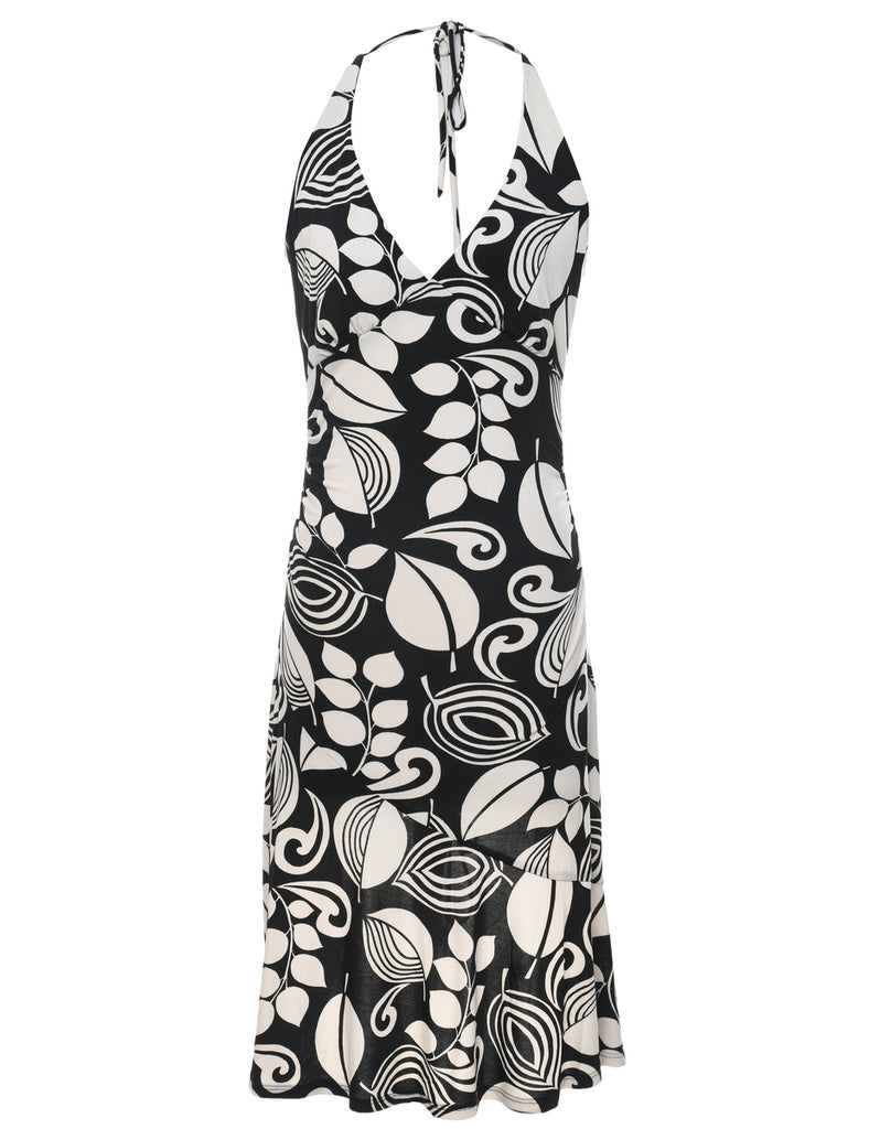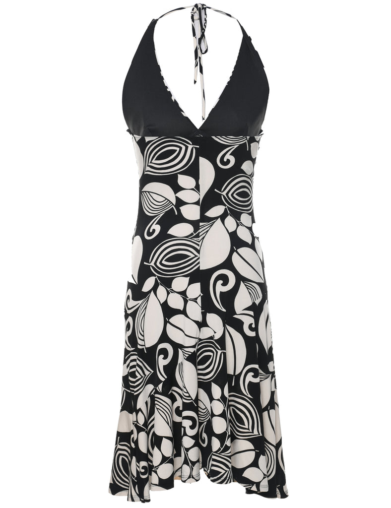 Backless dress in black & white with foliage,a halterneck. The size label mentions M but based on the actual measurements we consider it a size S.