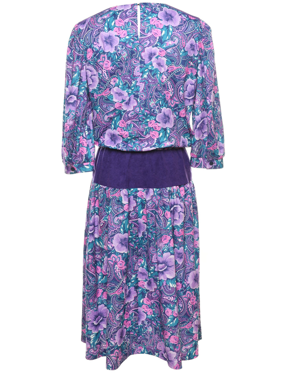 Floral print dress in purple with a round neck.