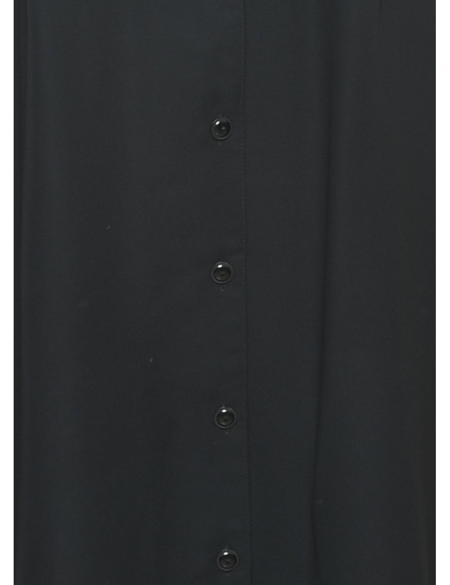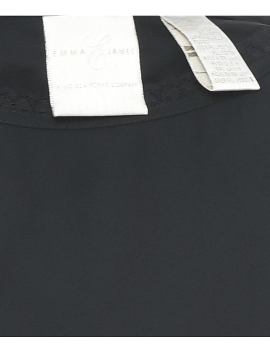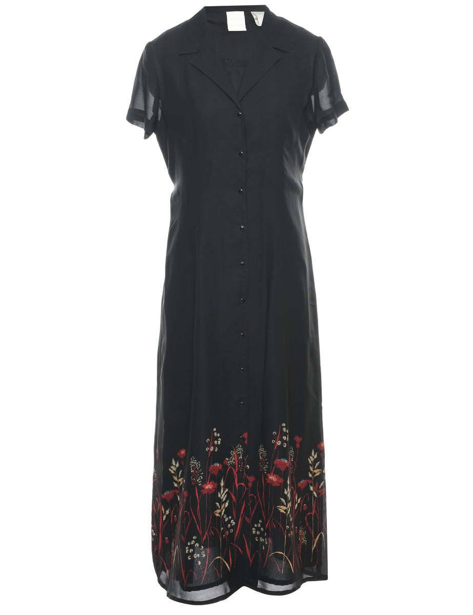 Floral print black dress with a revere front and full lining.