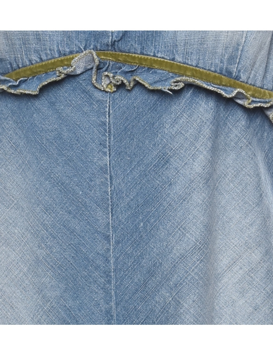 Tommy Hilfiger backless denim dress. Comes in stone wash with a halterneck and velvet trim. The size label mentions L but based on the actual measurements we consider it a size S.