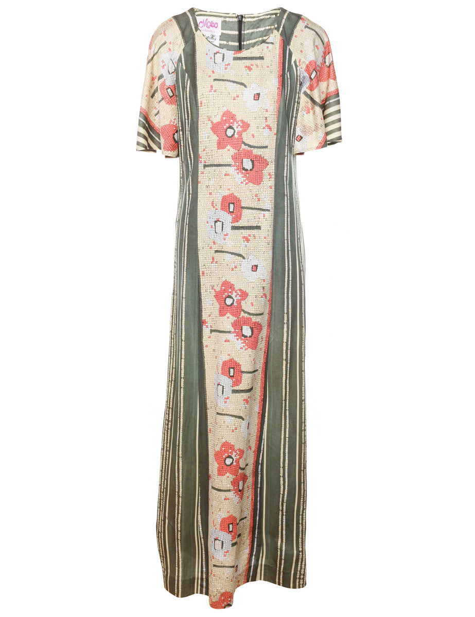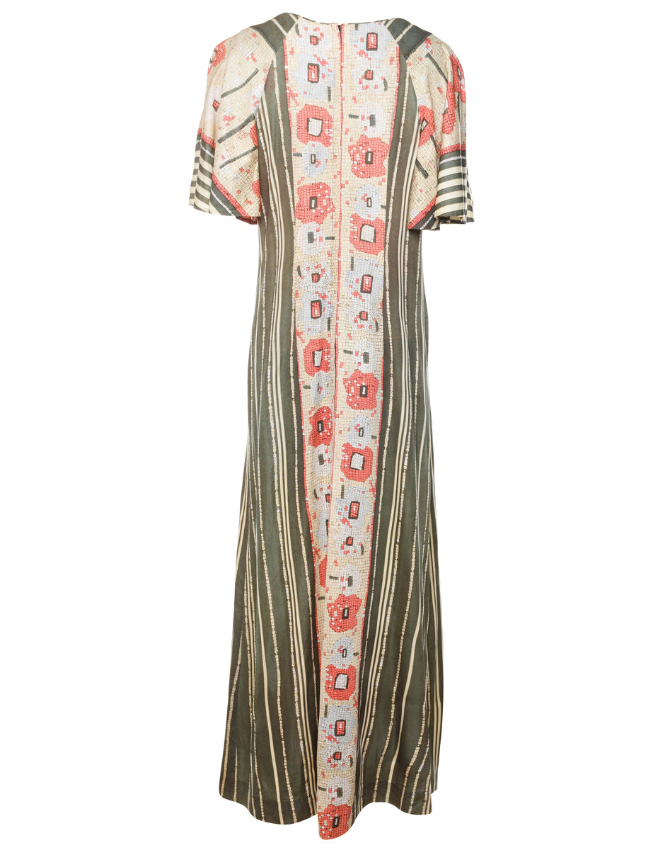Vintage 1970s Floral Print Pale Yellow & Pink Maxi Dress - M