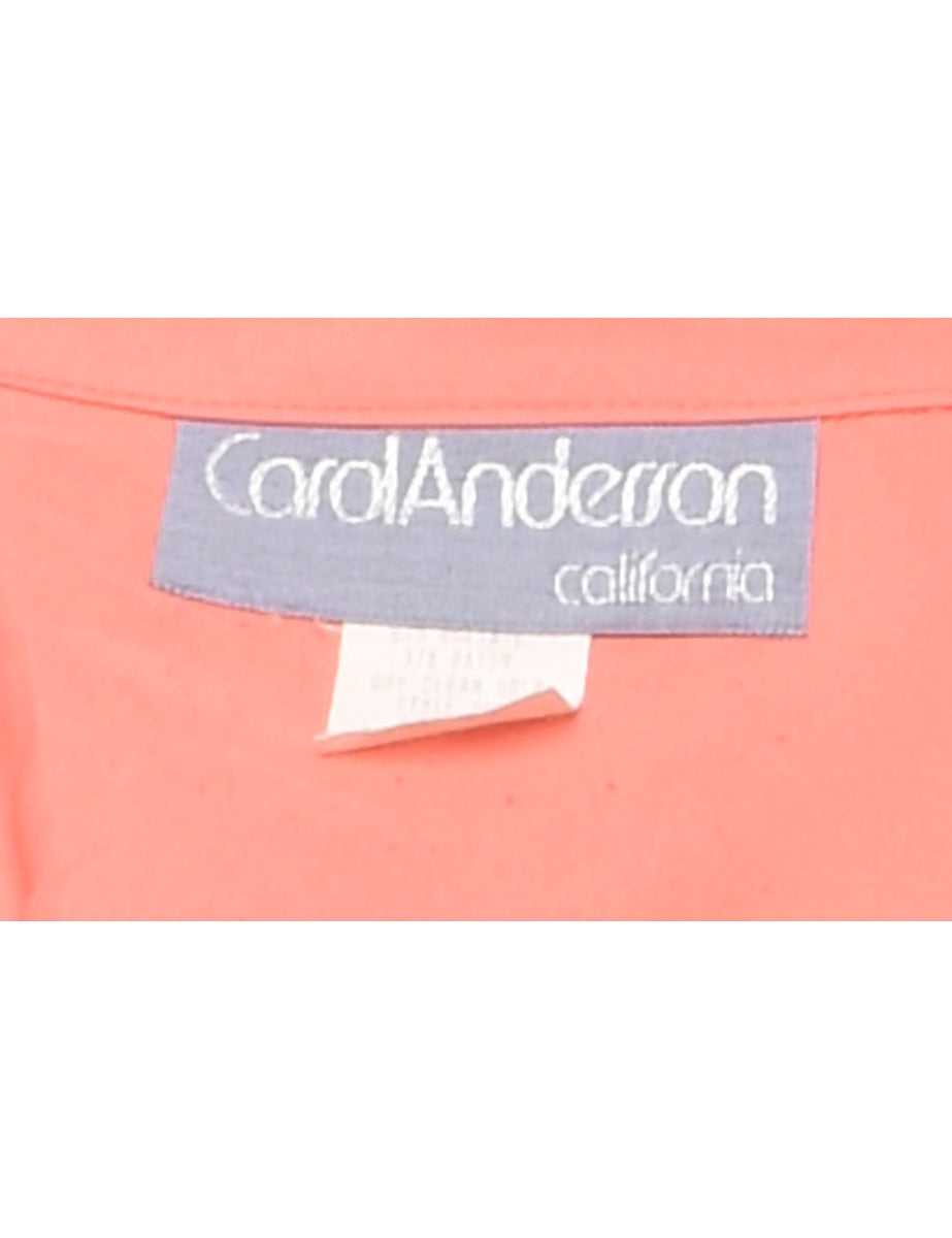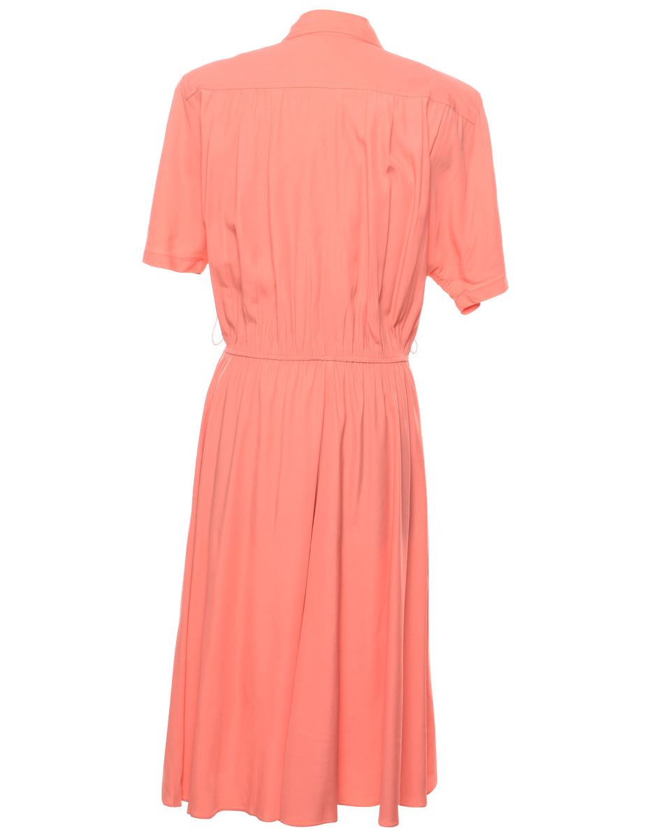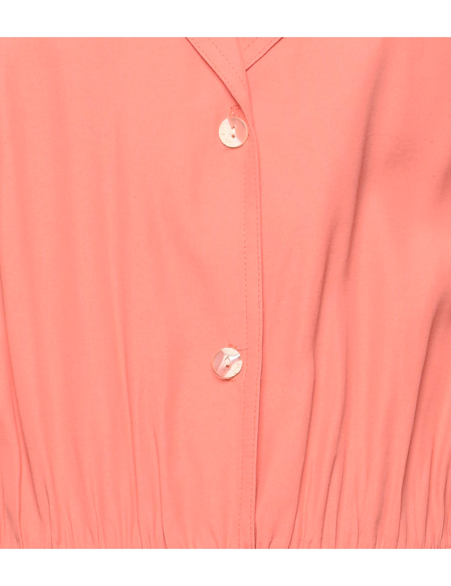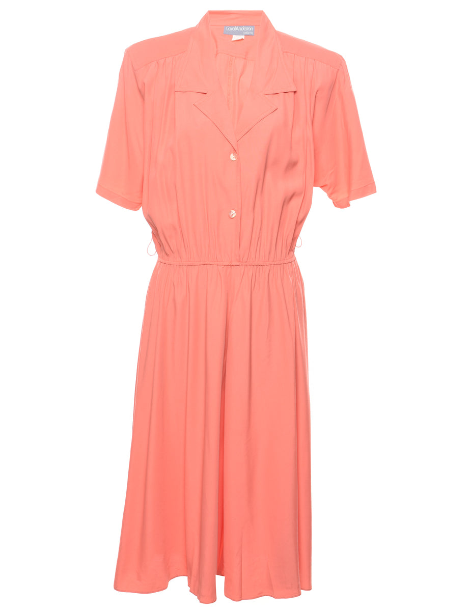 Button front shirt dress. Comes in coral with a revere front and batwing sleeves.
