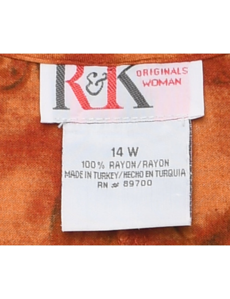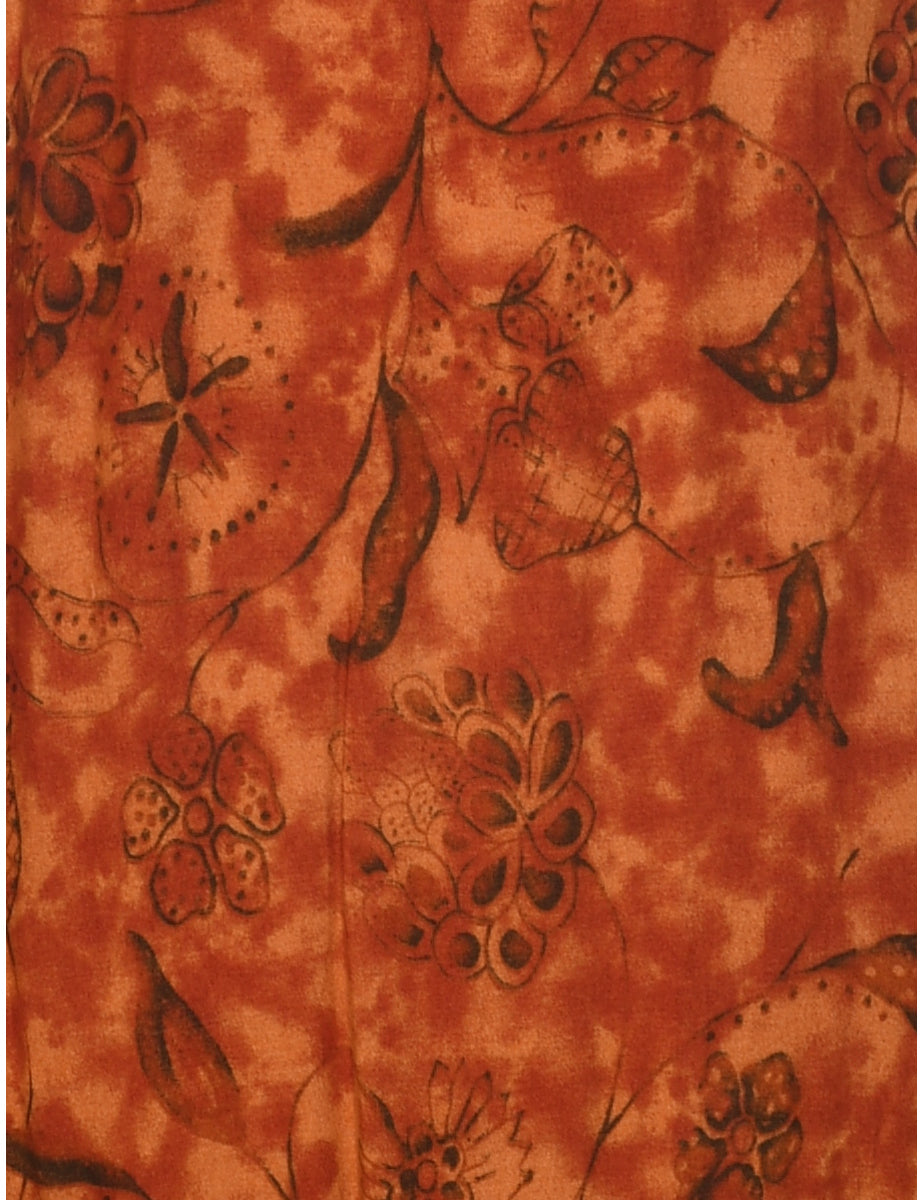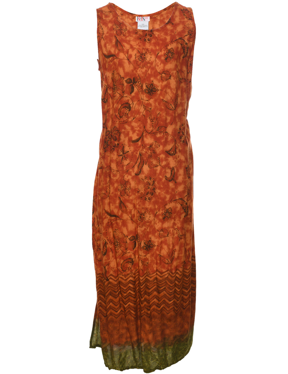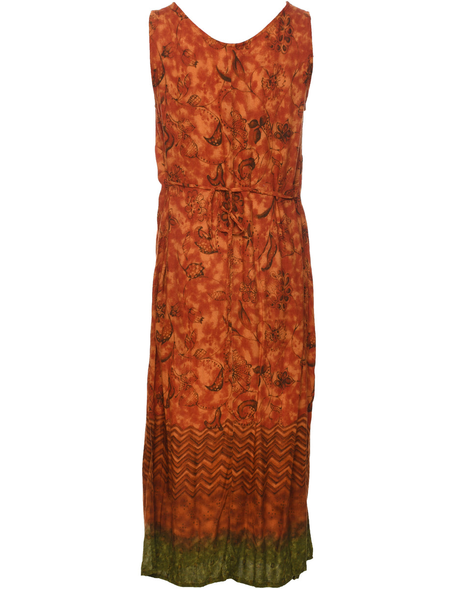 Floral print dress in burnt orange with back tie and slit.