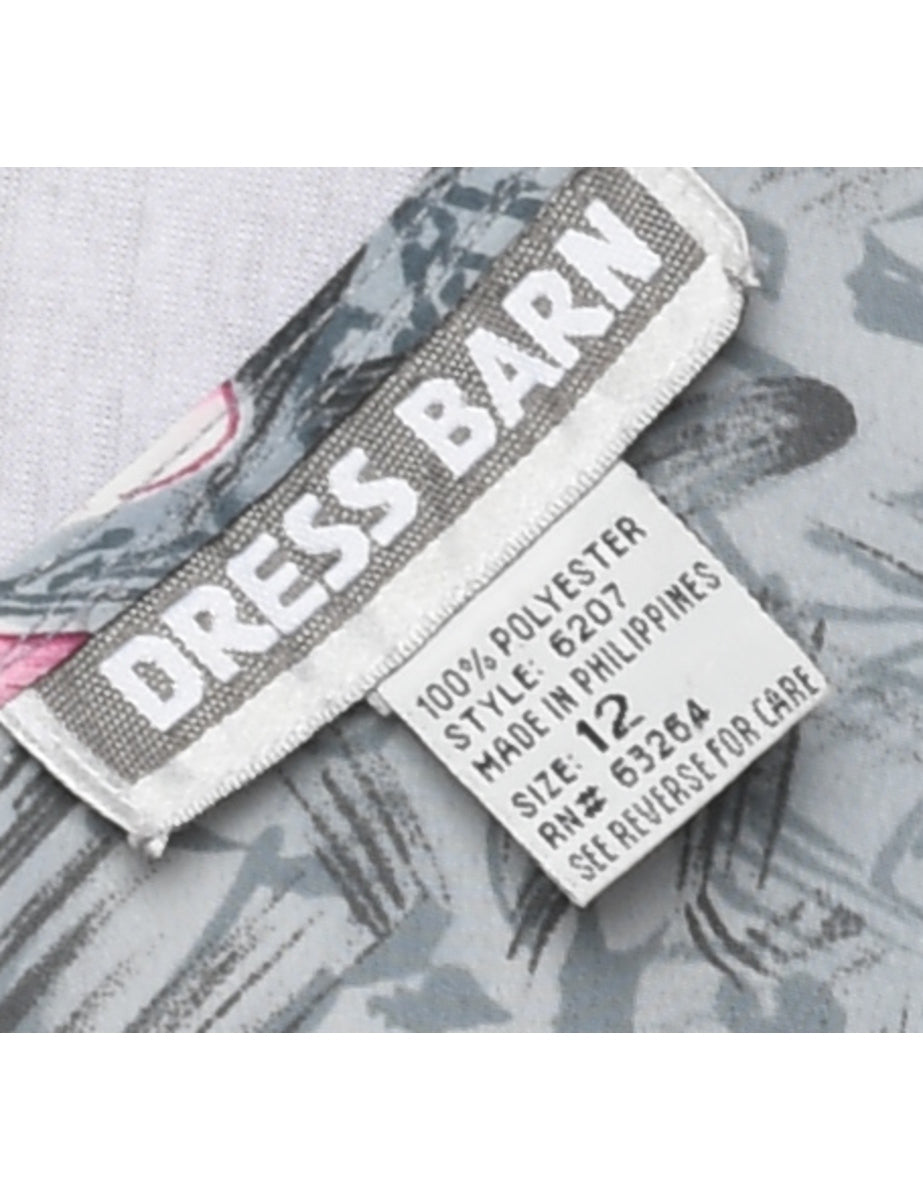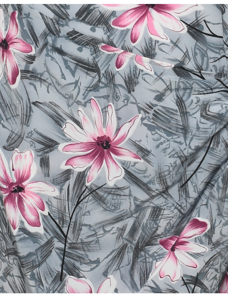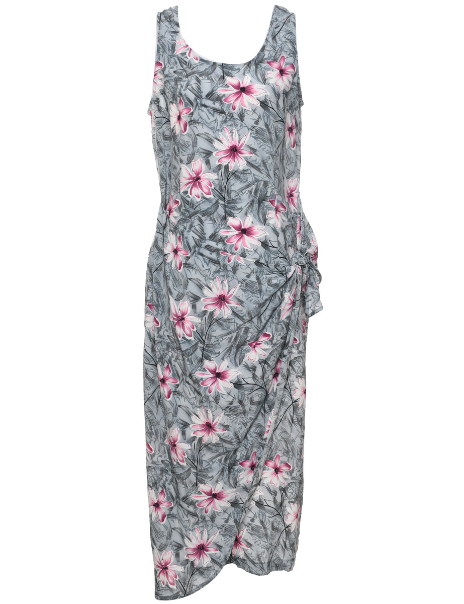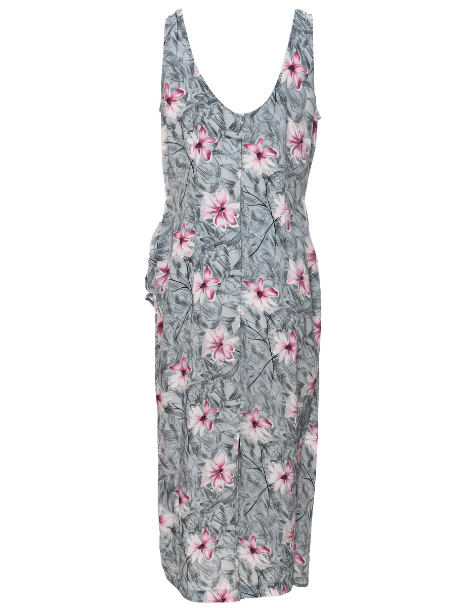 Floral print dress in light grey with a round neck and a tiered skirt.
