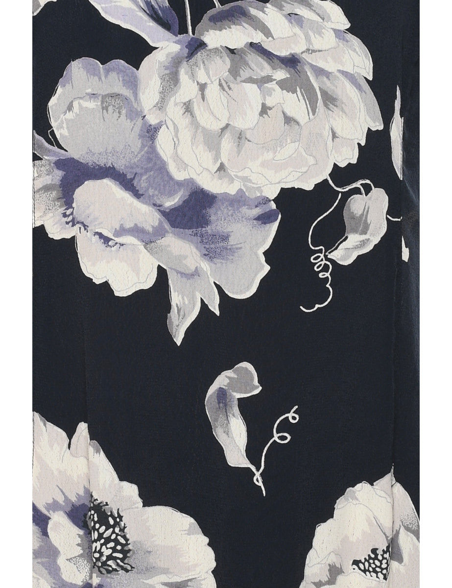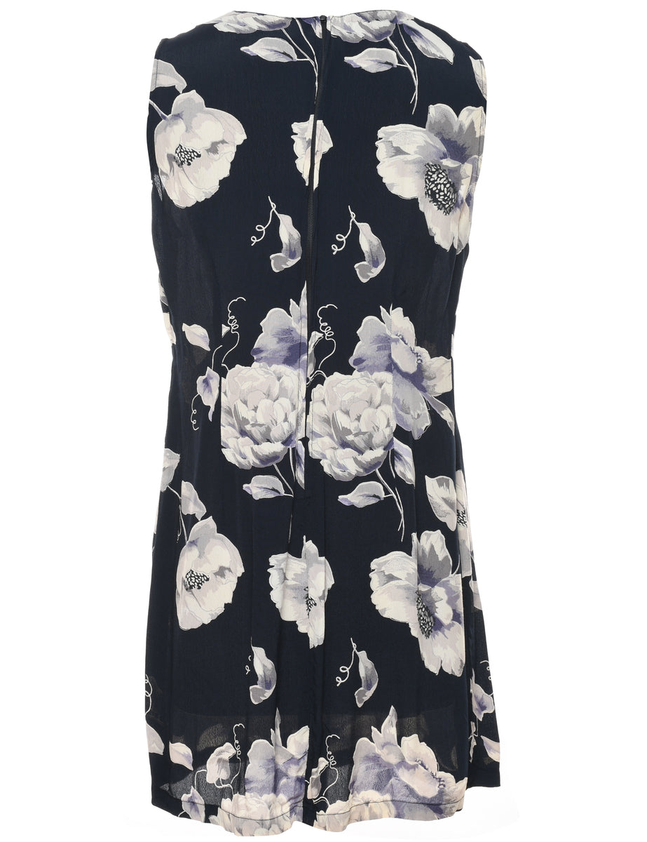Floral print navy summer dress with a round neck.