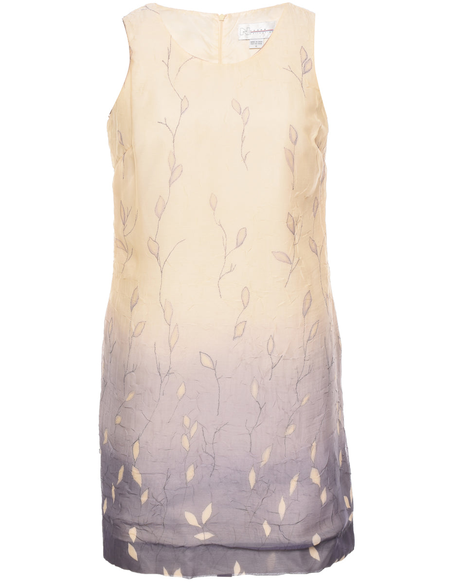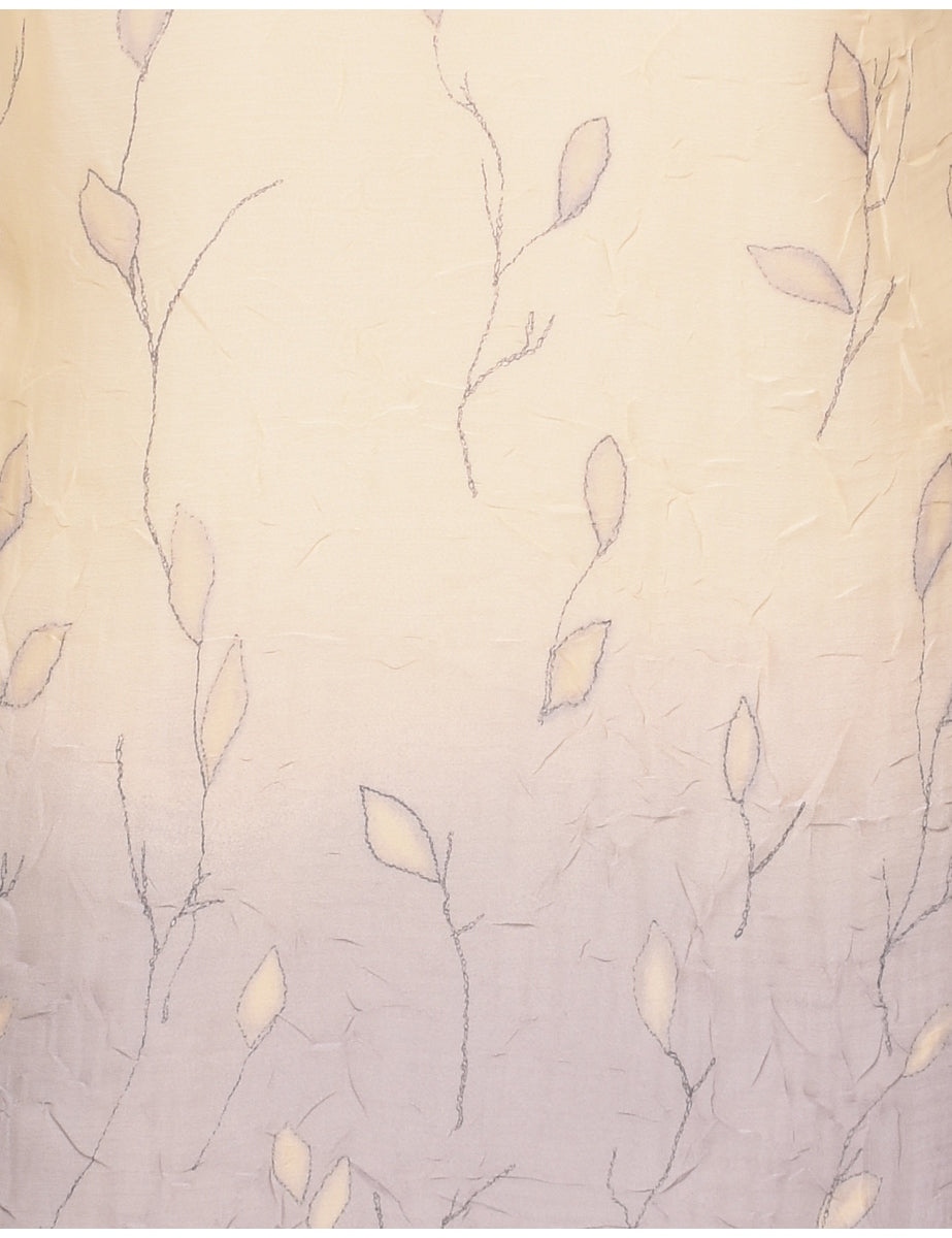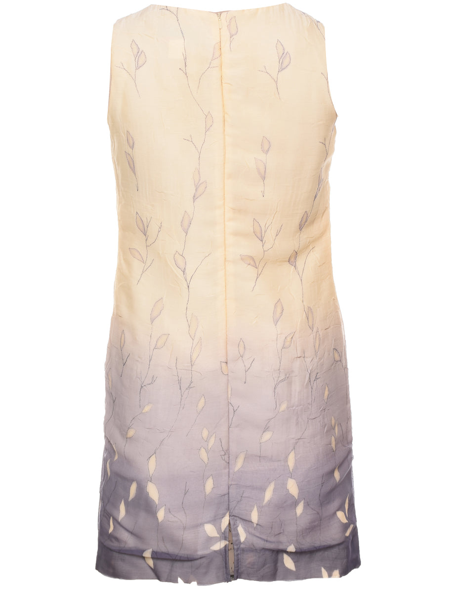 Leafy print dress in light grey & pale yellow with slit and round neck.