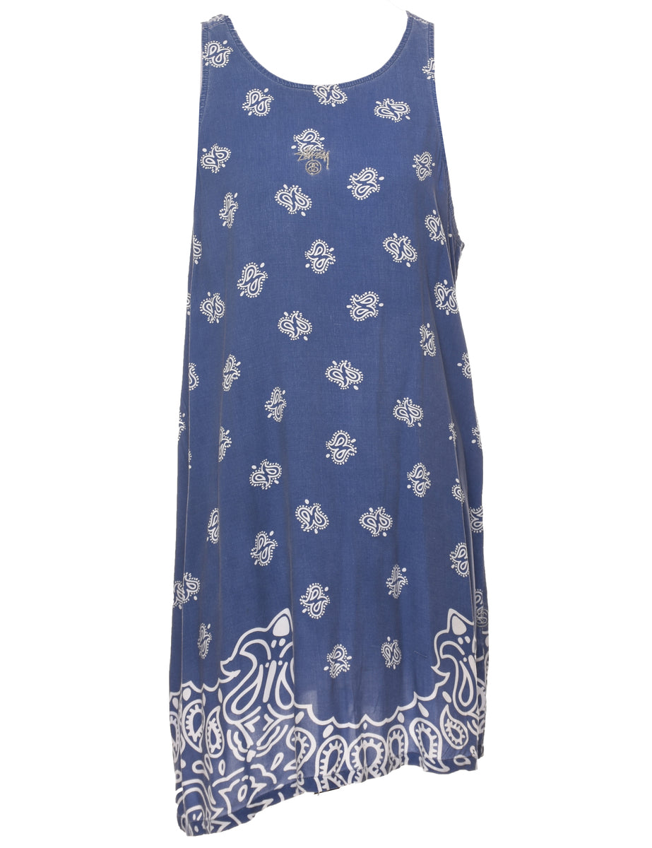 Paisley print dress in light blue with a round neck and an asymmetric hem.