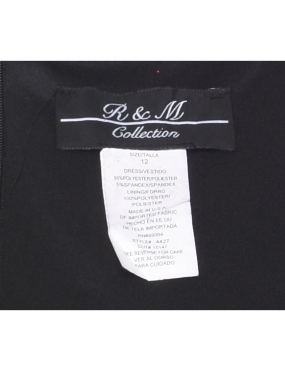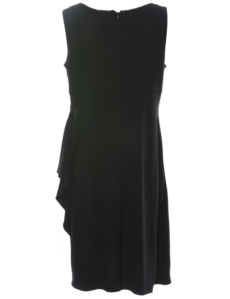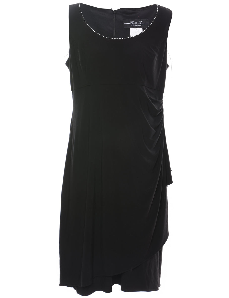 Midi length evening dress. Comes in black with an asymmetric hem and ruched detailing.