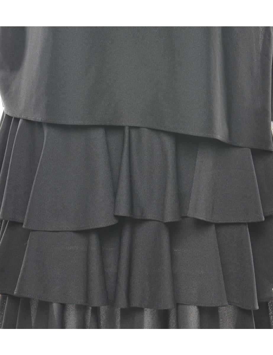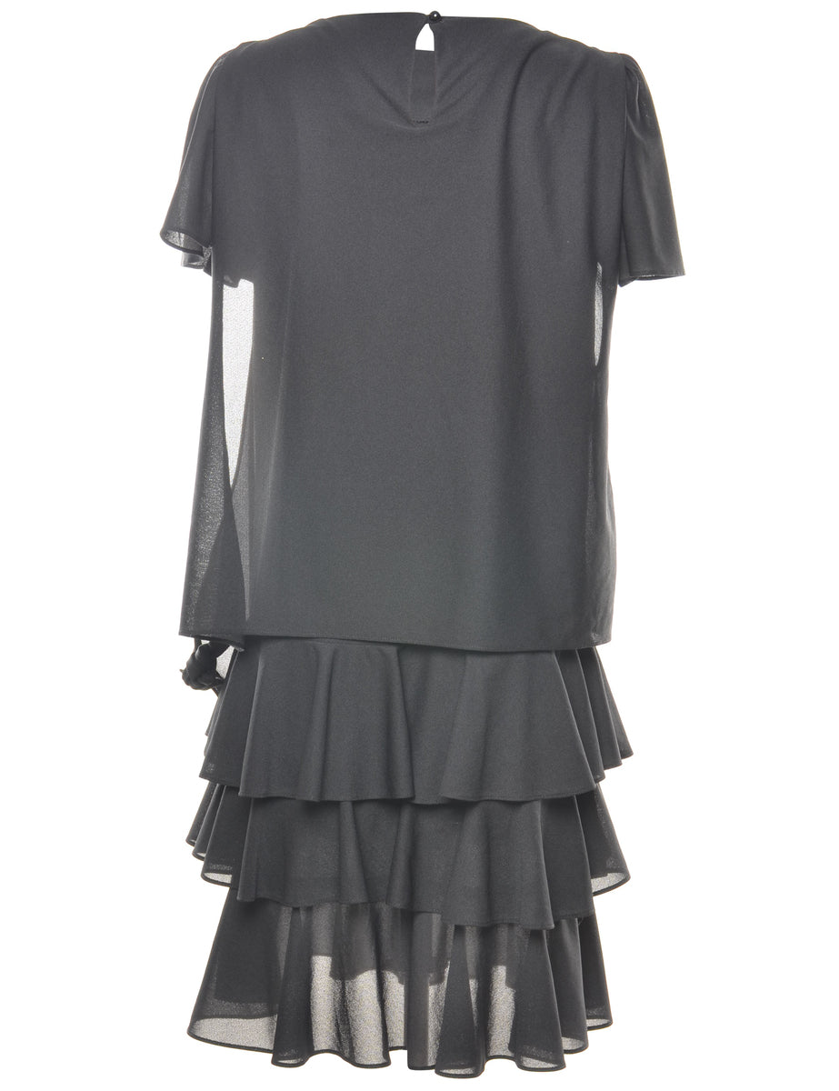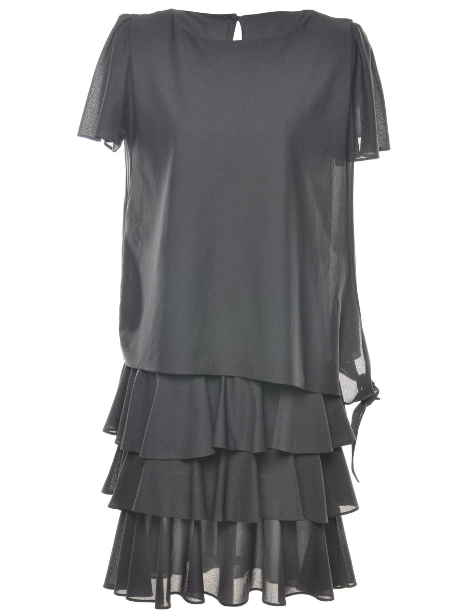 Midi length shift dress. Comes in black with removable shoulder pads and a ra-ra skirt.