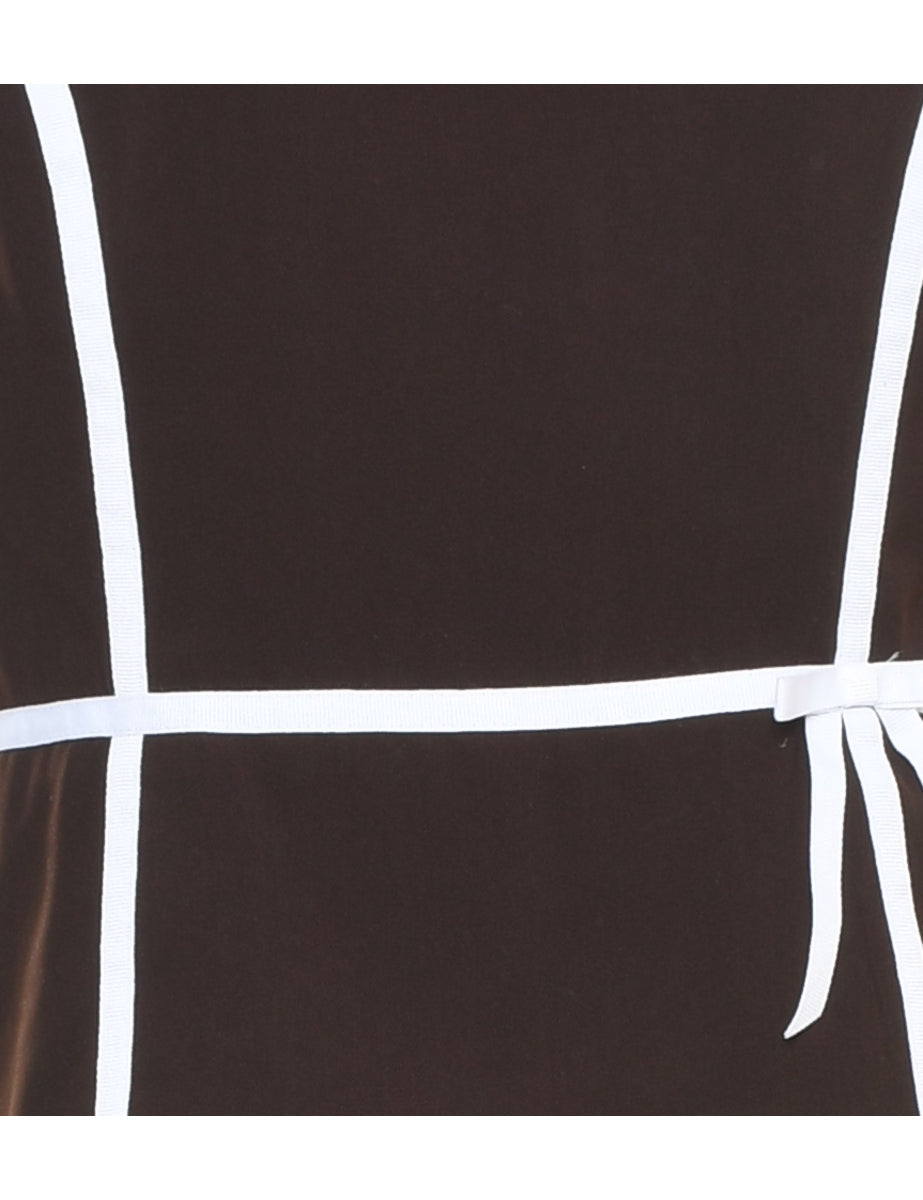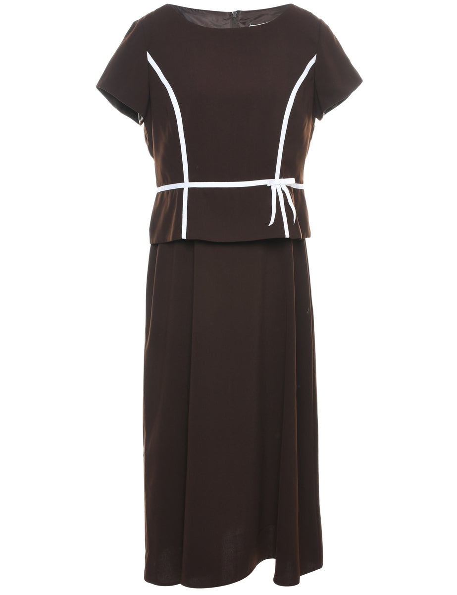 Brown dress with a boat neck and contrasting trim.