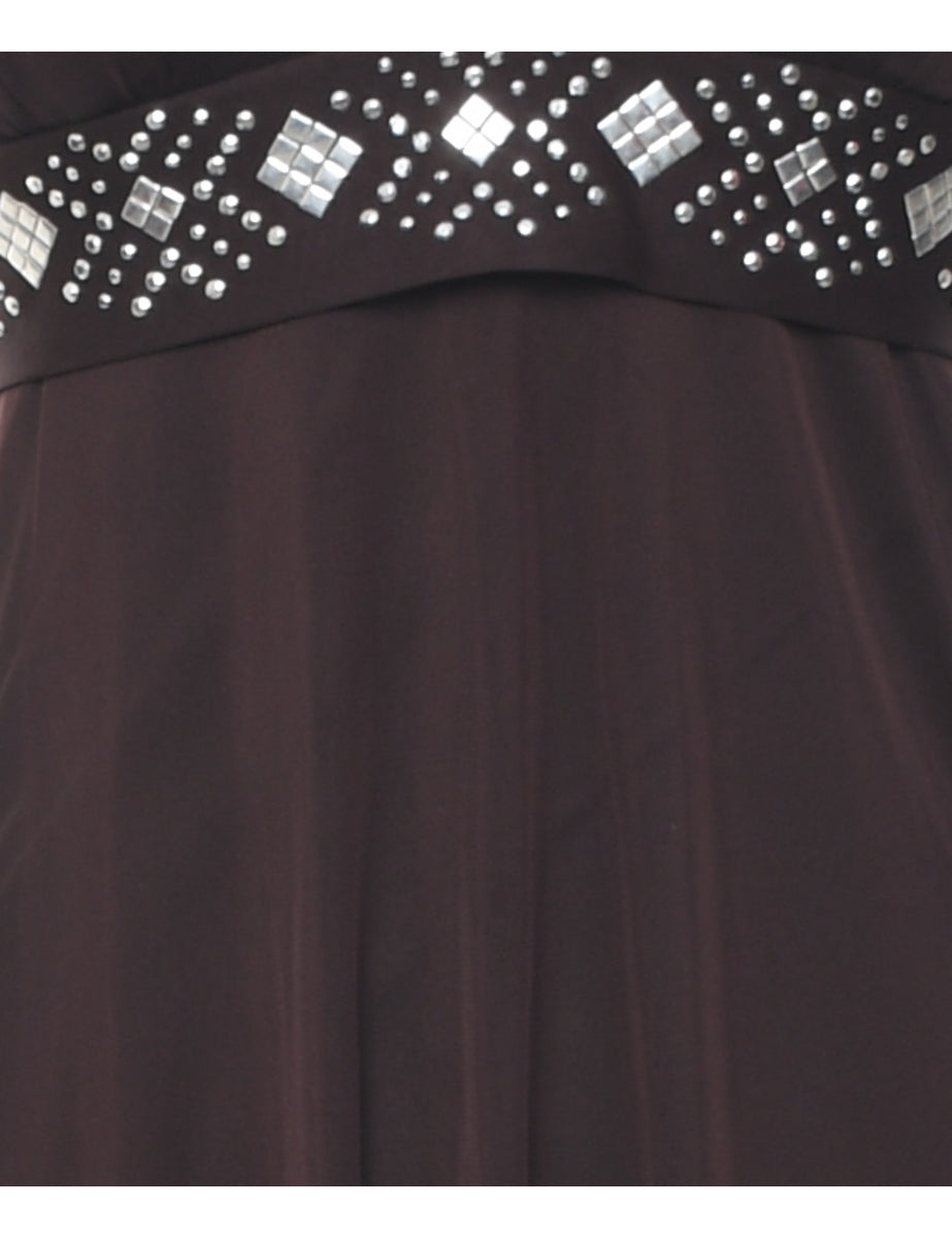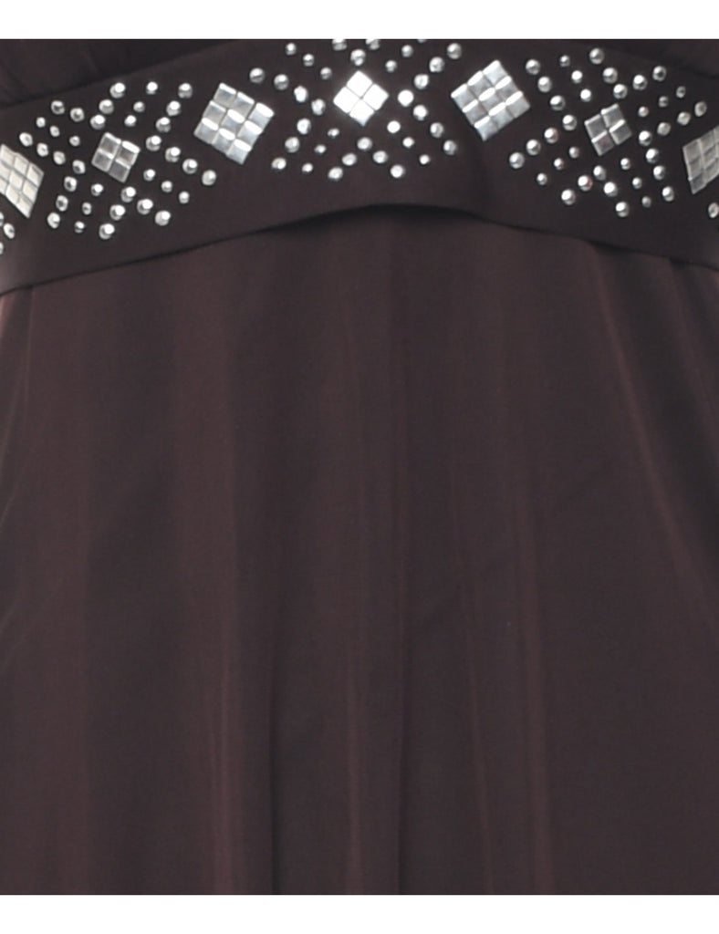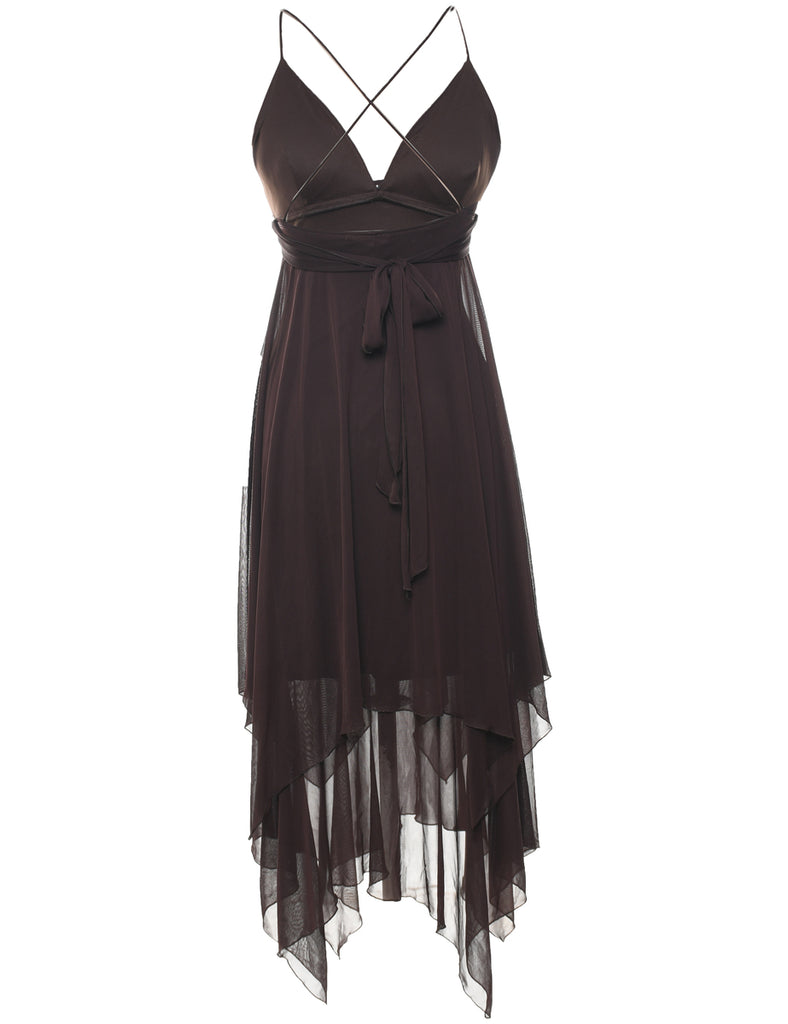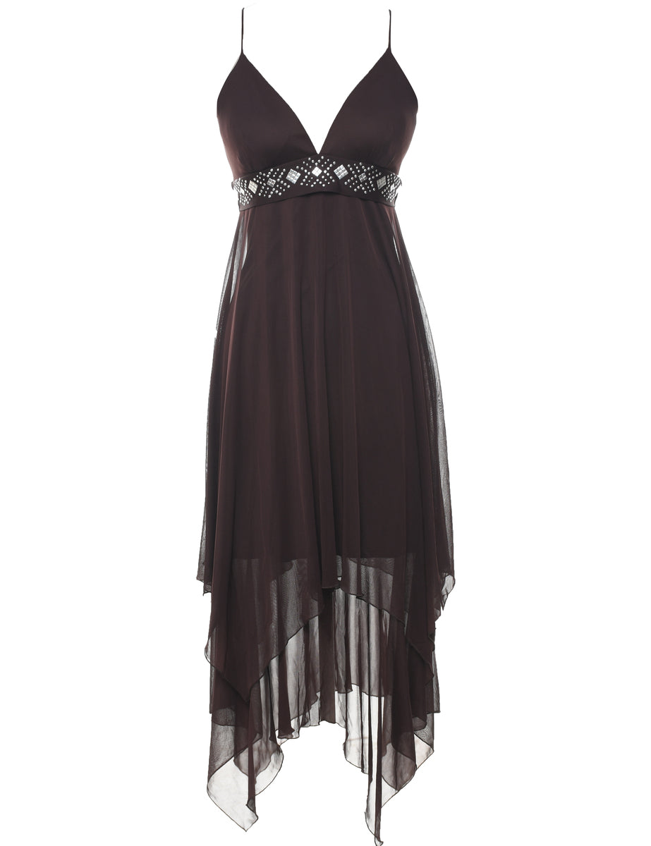 Dark brown strappy Y2K evening dress complete with an asymmetric hem and full lining.