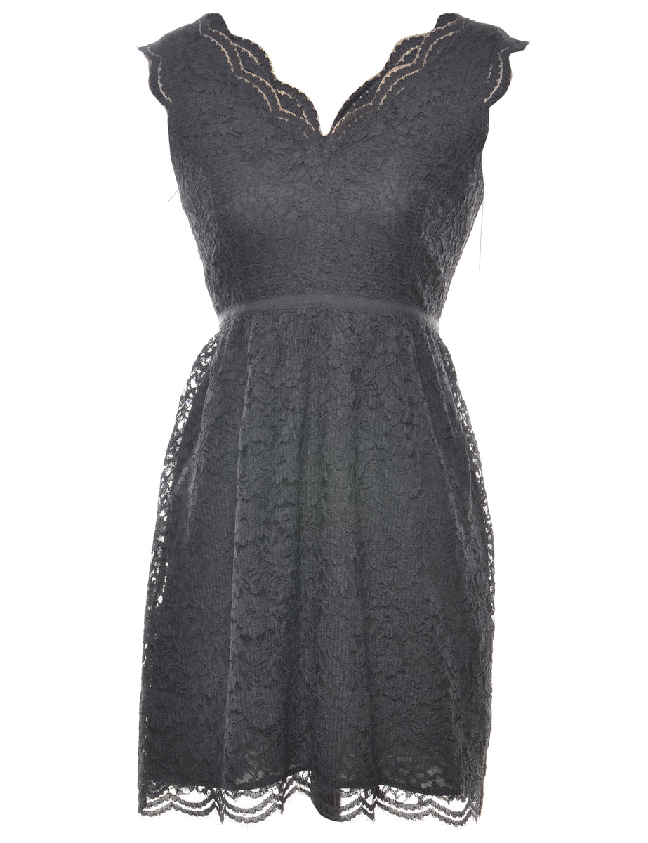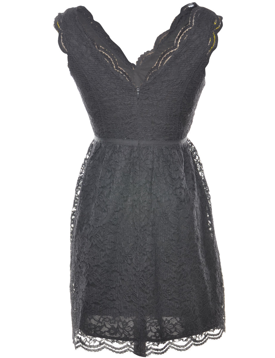 Floral lace black evening dress with a scalloped hem and full lining.
