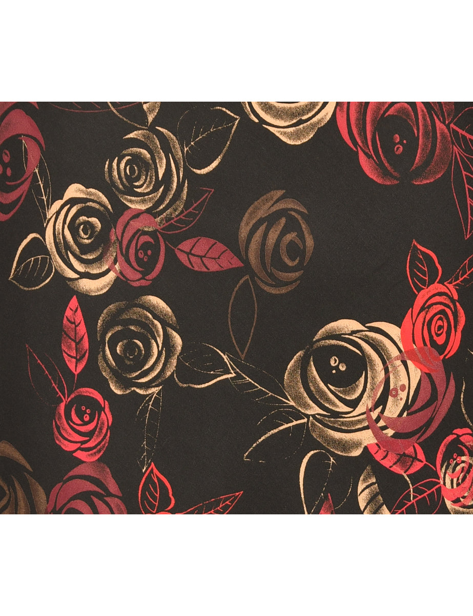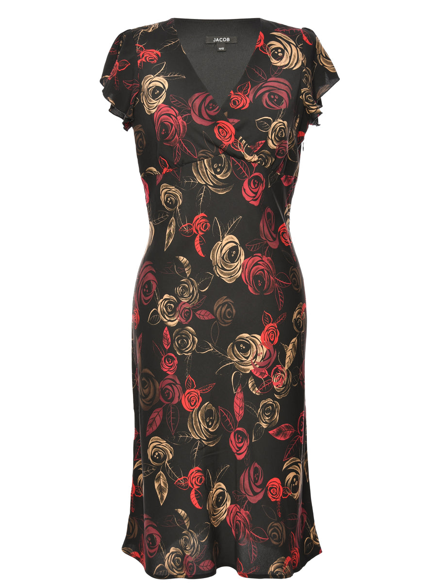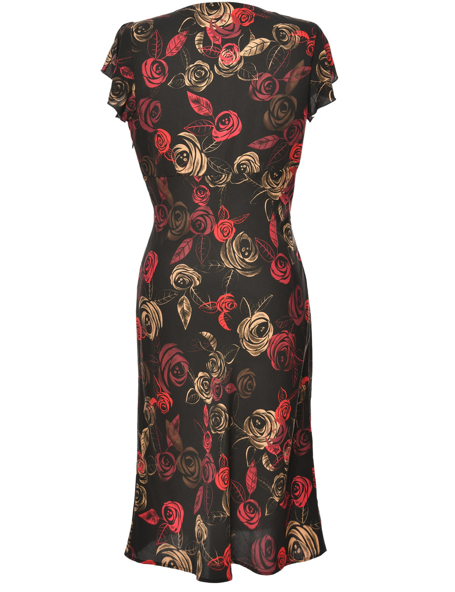 Vintage Floral Print Black, Red & Cream V-Neck Dress - M