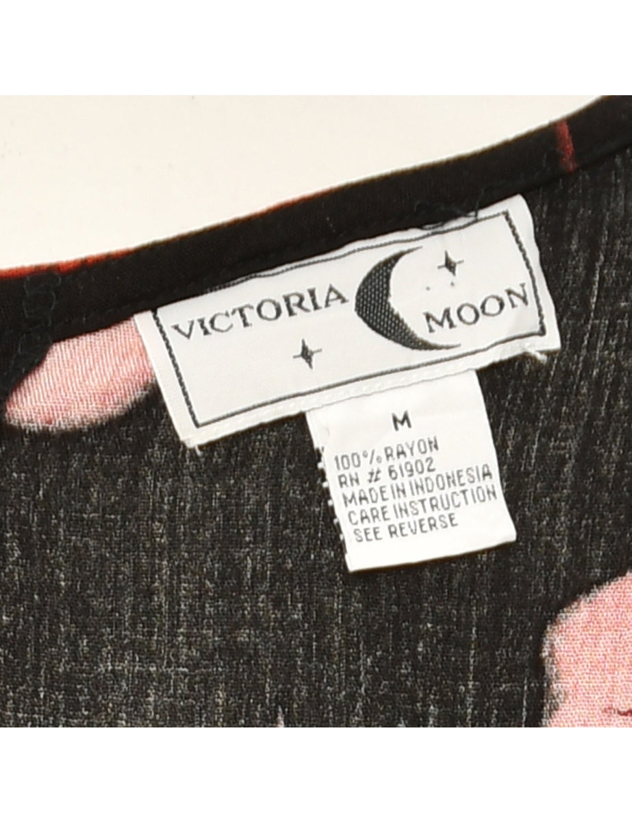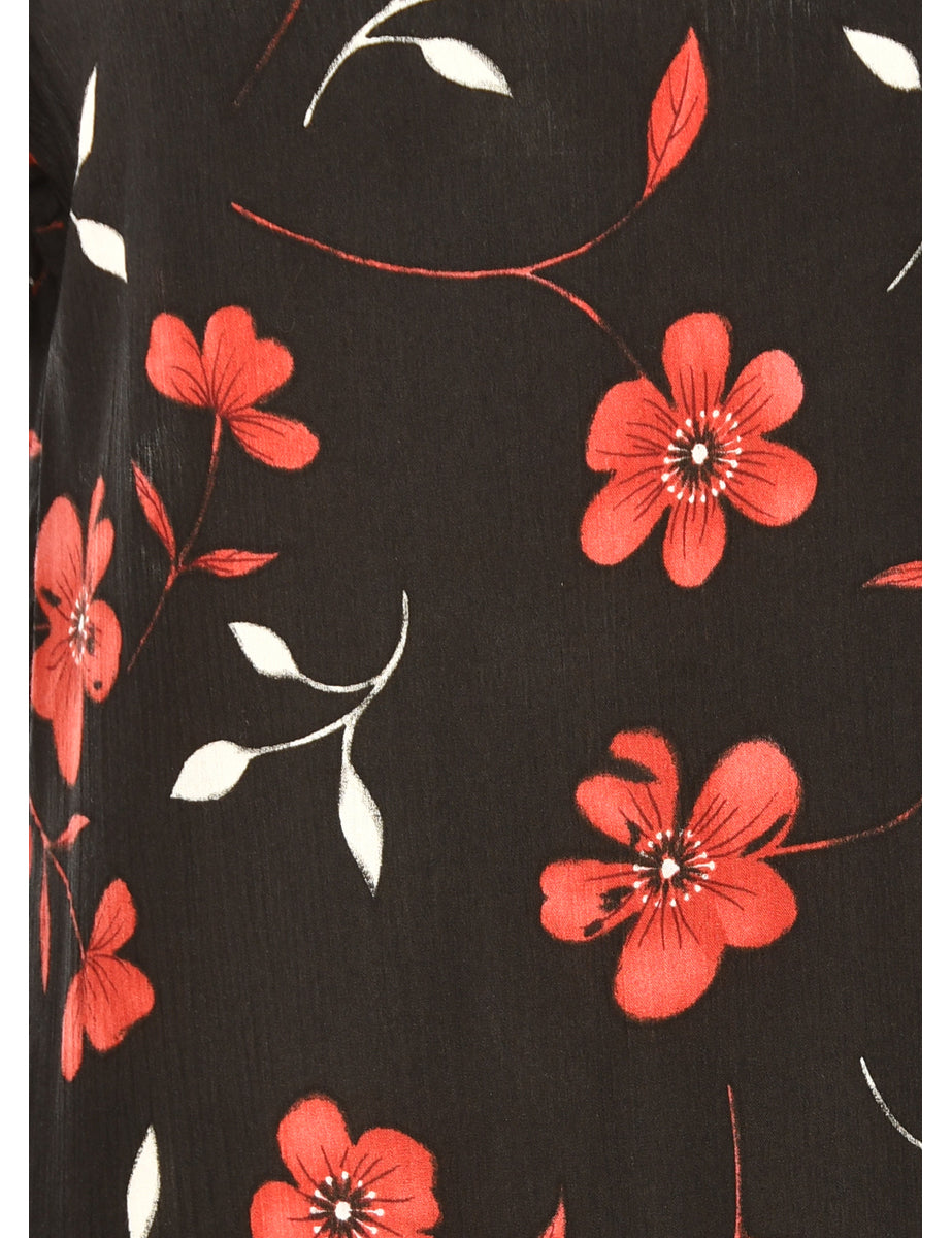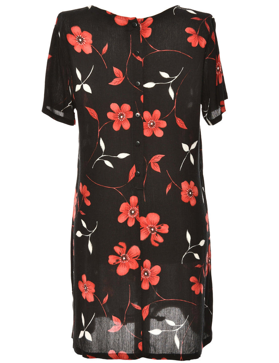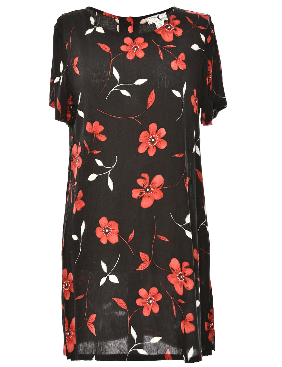 Vintage Floral Print Black & Red Dress - M