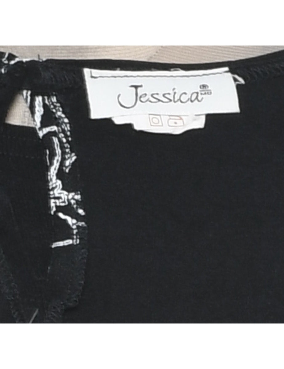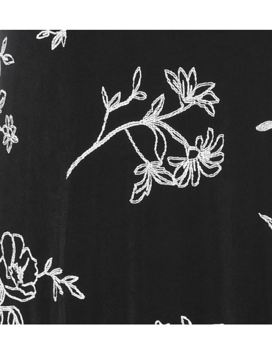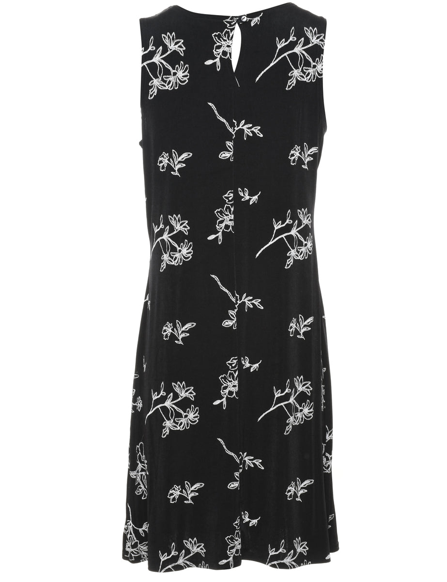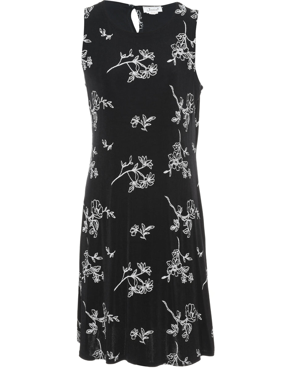 Floral print dress in black with a round neck.
