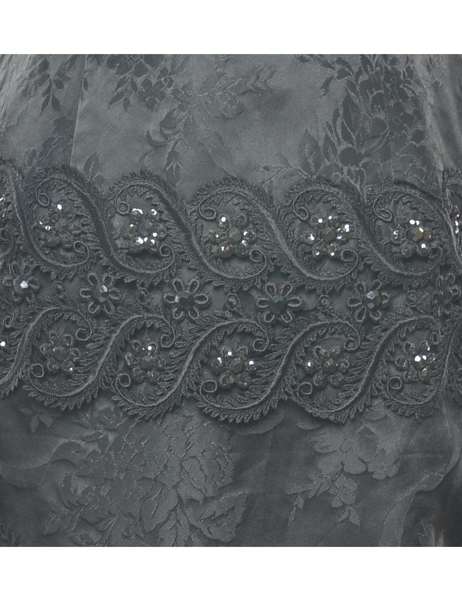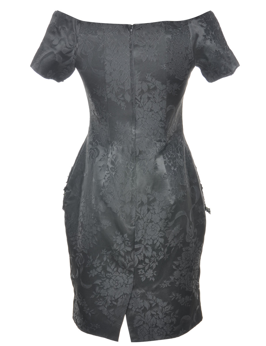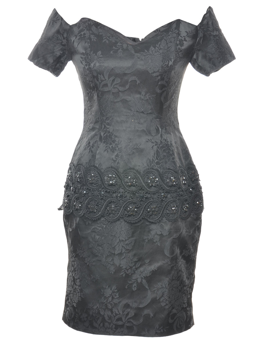Floral print party dress. Comes in black with beading and lace trim.