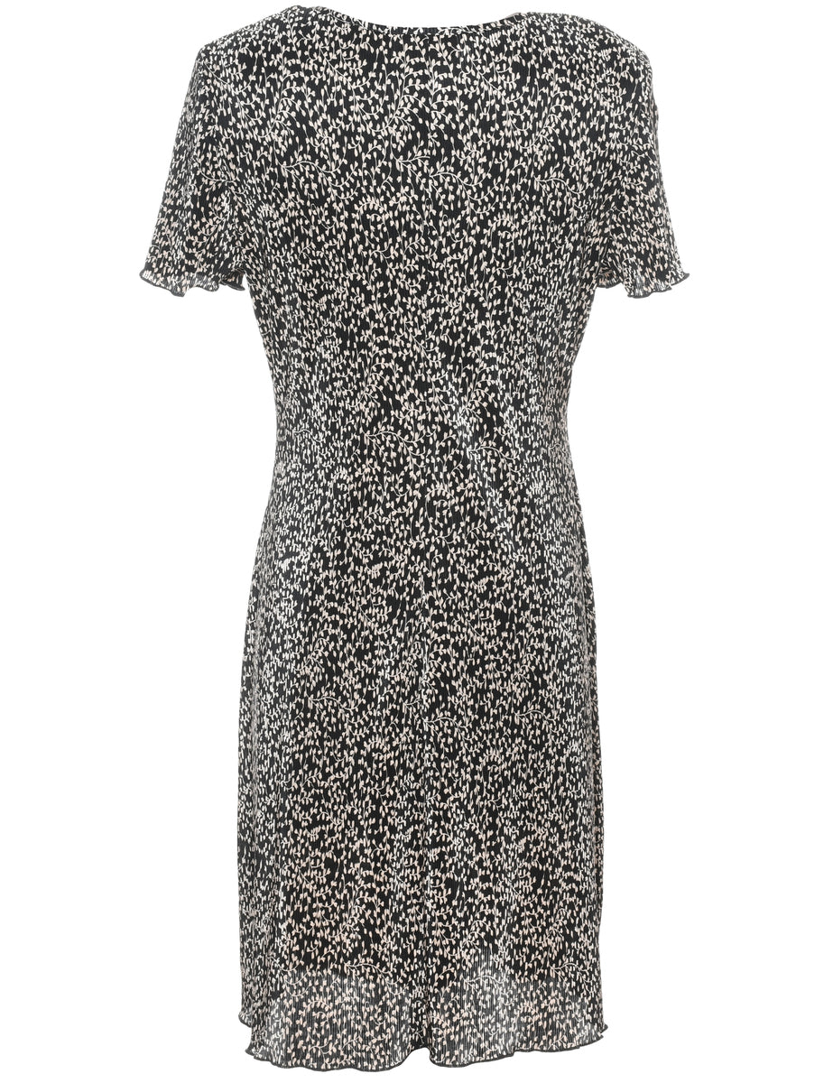 Leafy print dress in black & light brown with a round neck and removable shoulder pads.