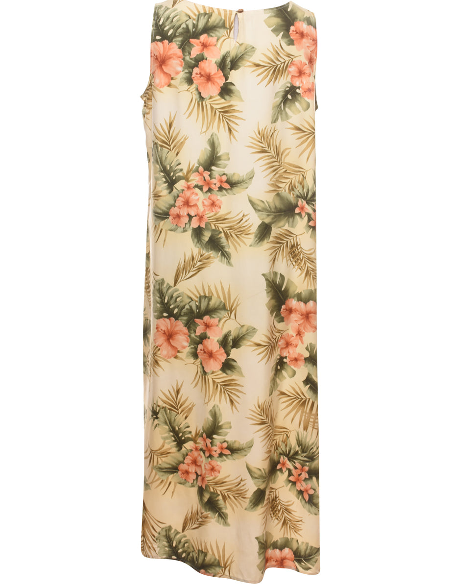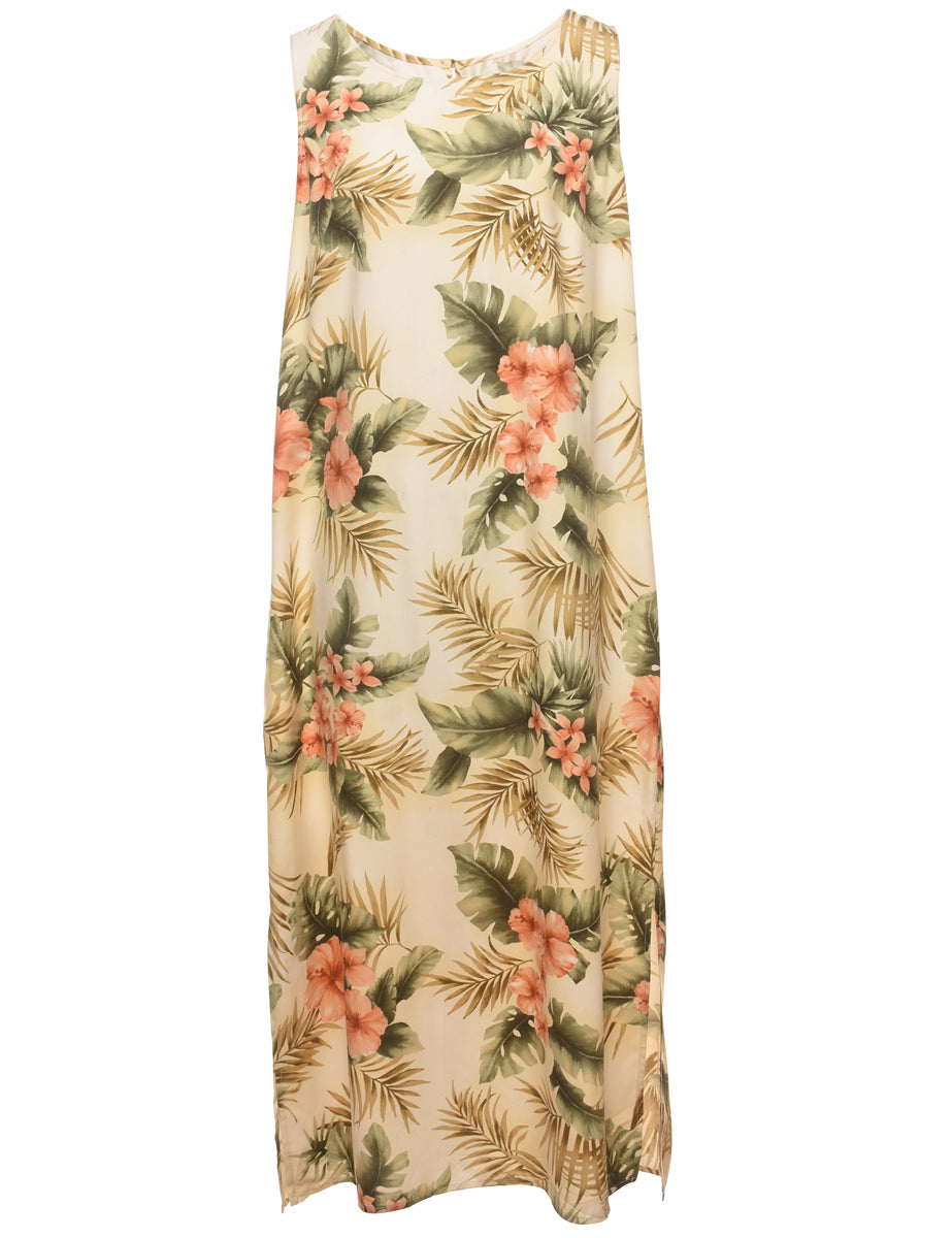 Leafy print pale yellow & light green sleeveless dress complete with a round neck.