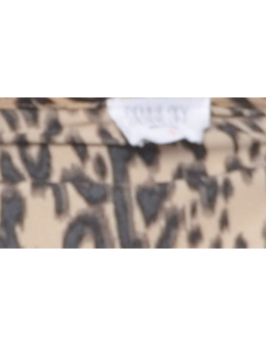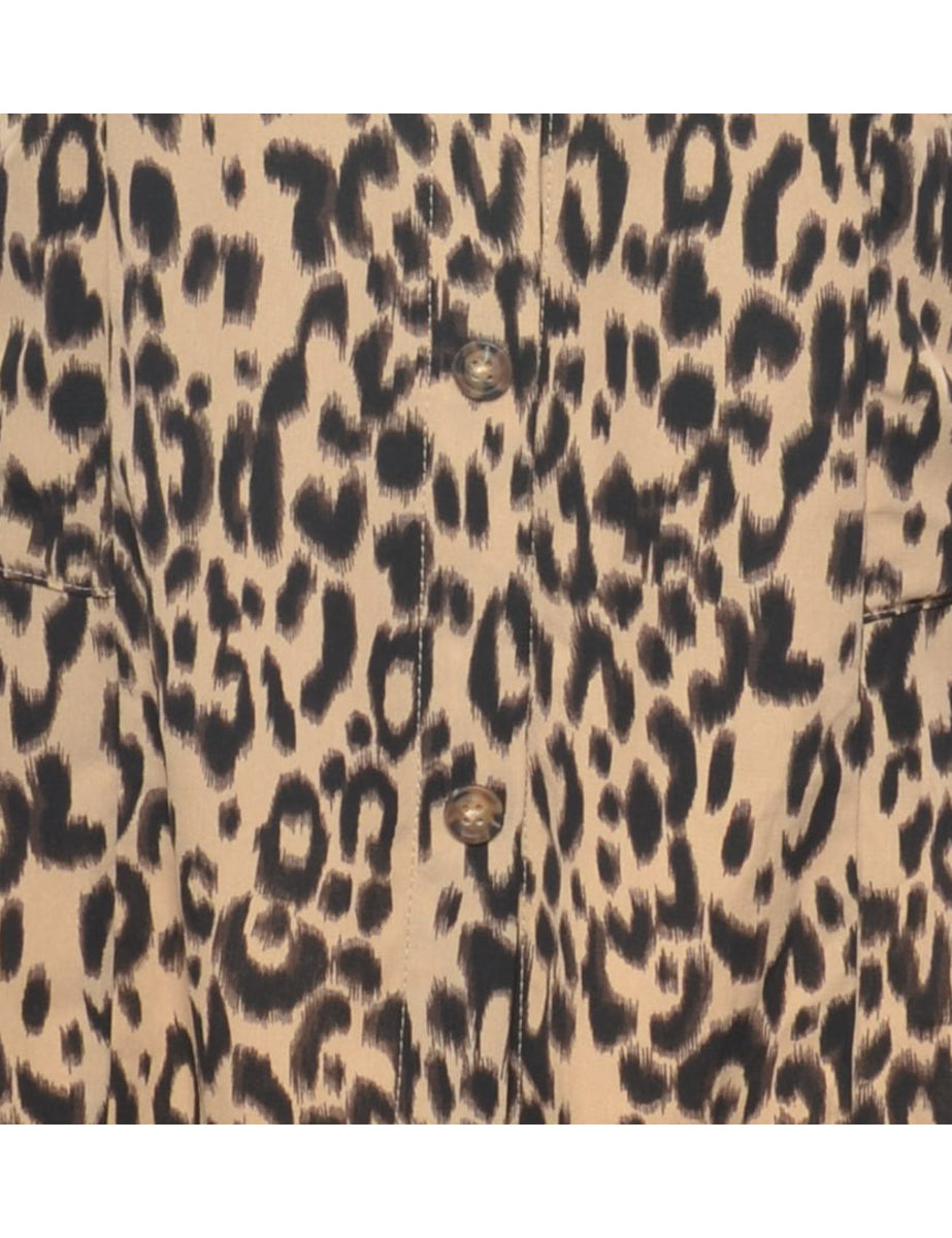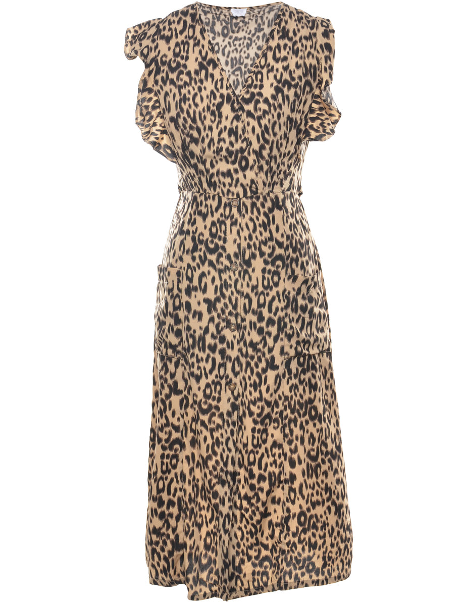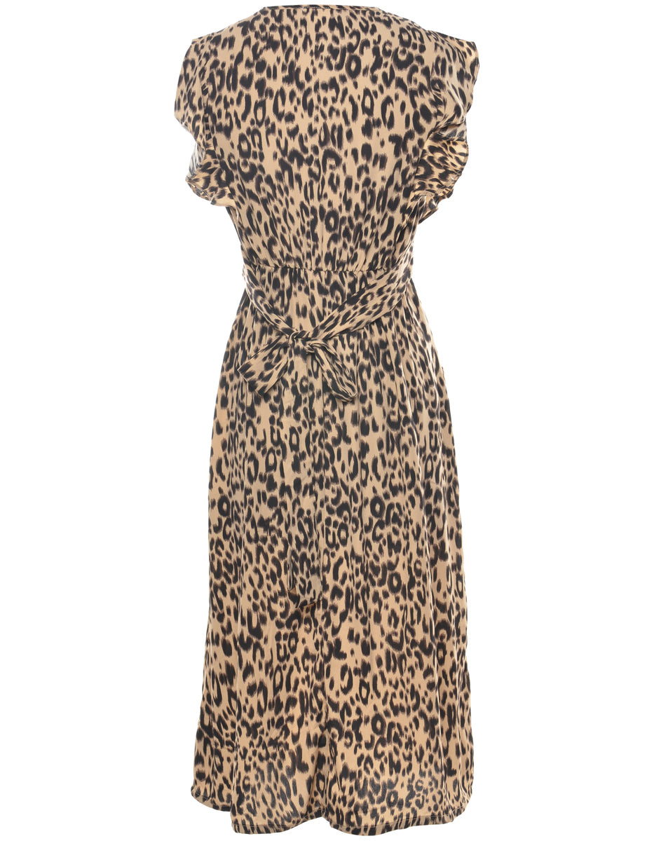 Midi length dress. Comes in light brown with leopard print, back tie and frills.