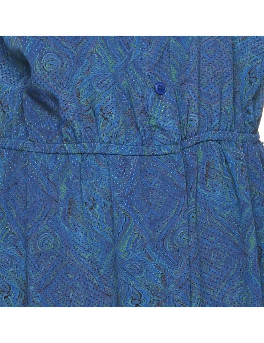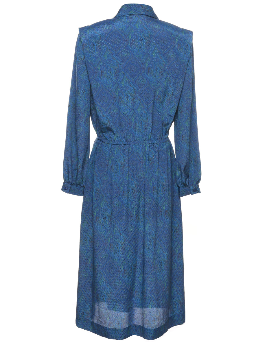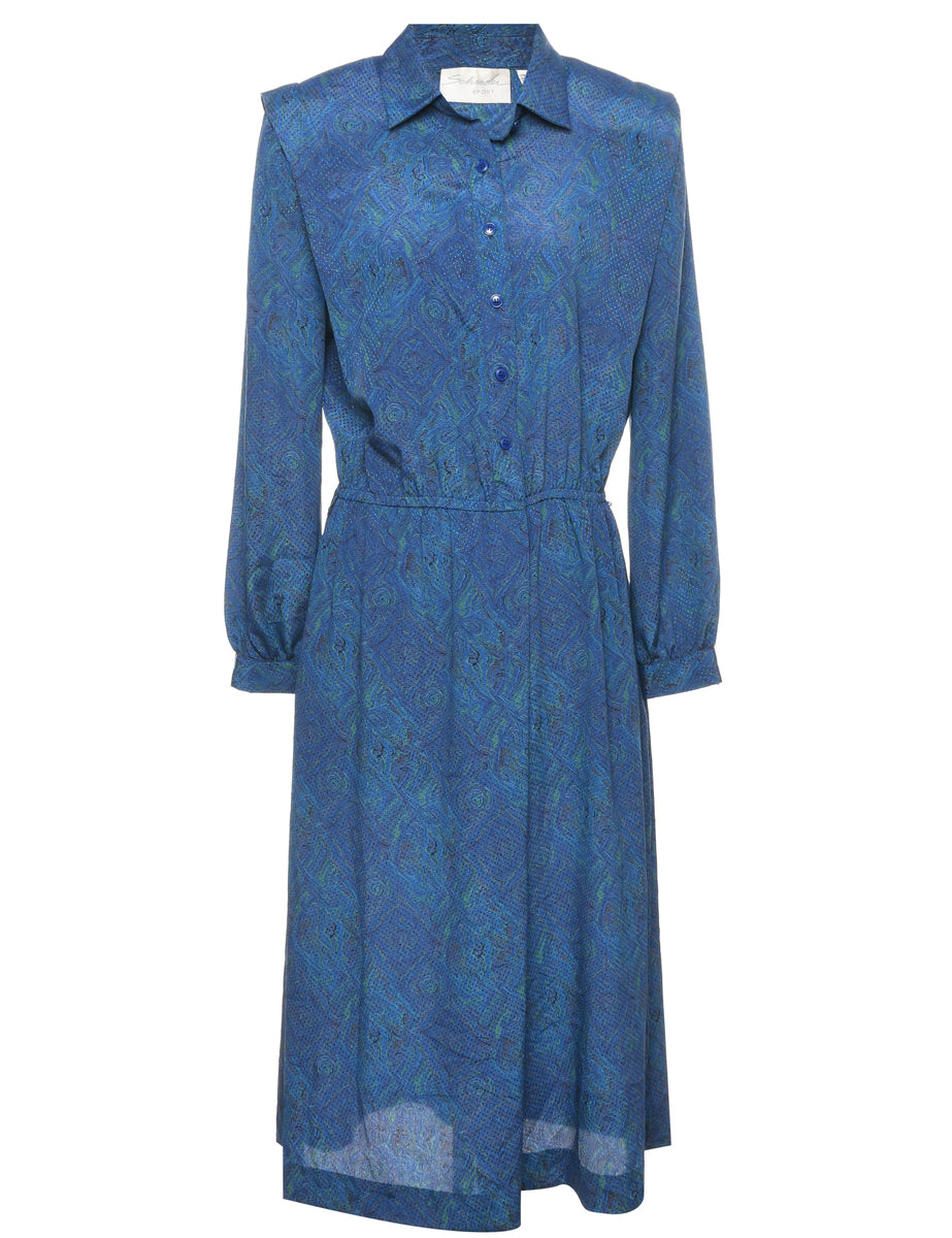 Long sleeved shirt dress in blue with a classic collar and removable shoulder pads.