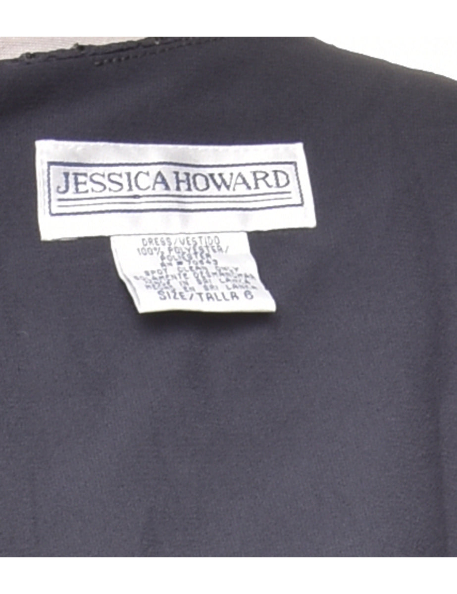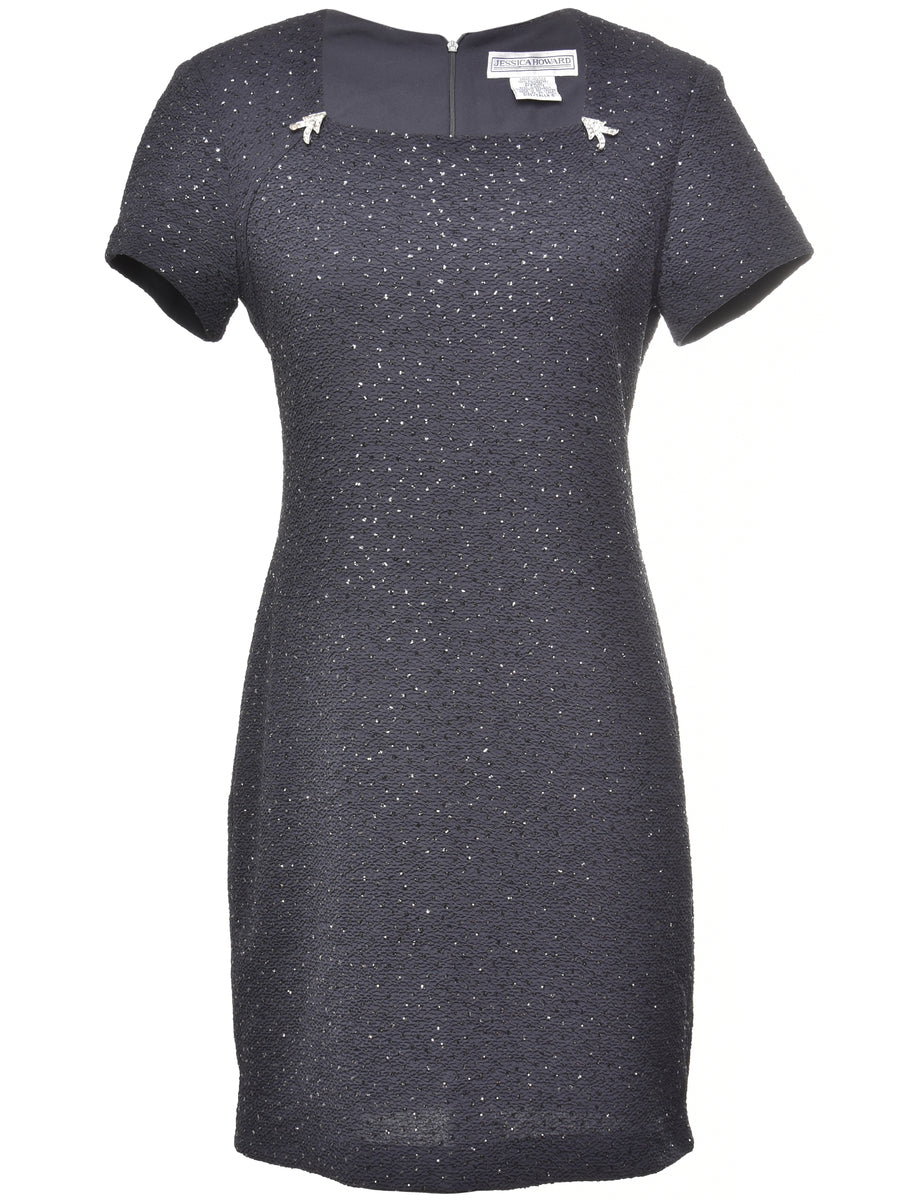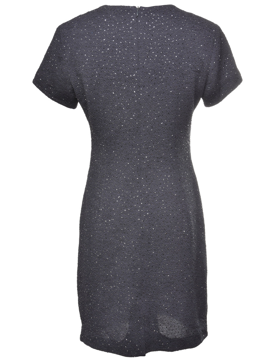 Metallic evening dress. Comes in dark grey with a square neck and removable shoulder pads.