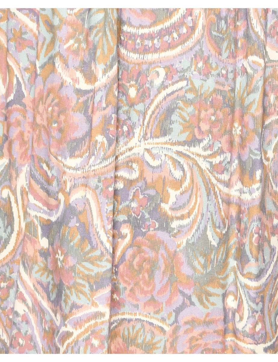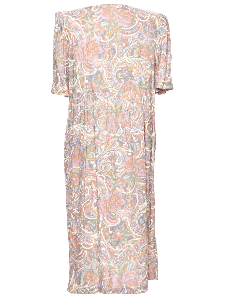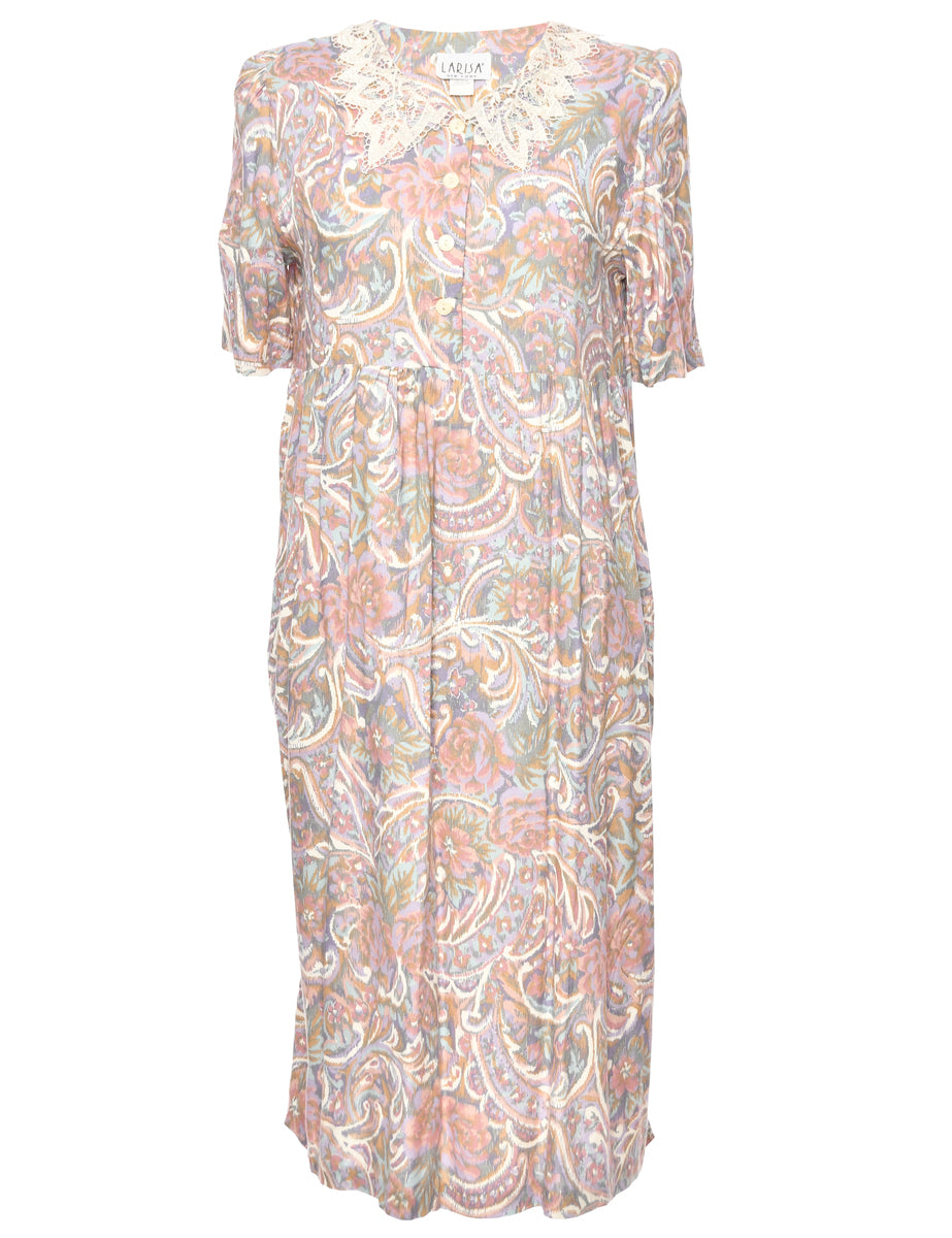Button front pale pink paisley dress complete with built in shoulder pads and a lace trim collar.