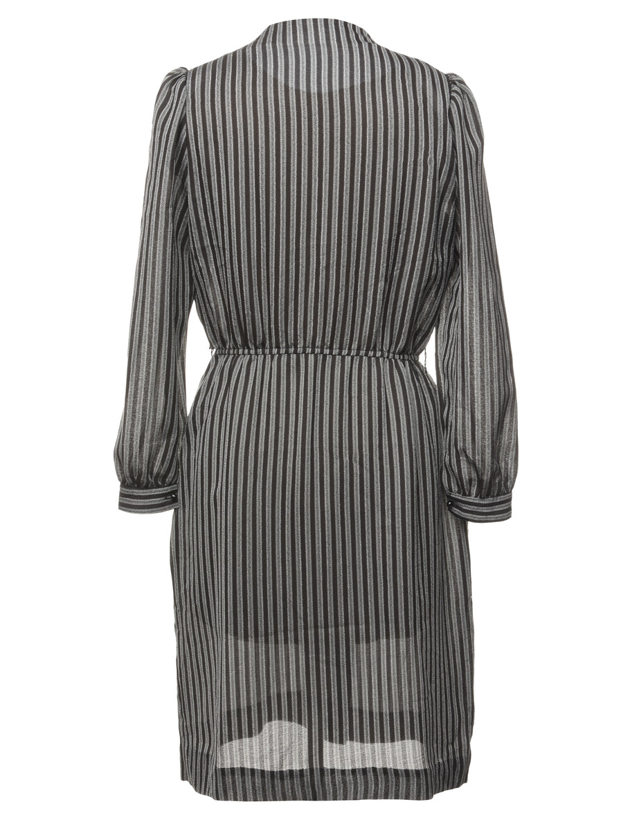 Pinstriped dress in black with contrasting collar and removable shoulder pads.