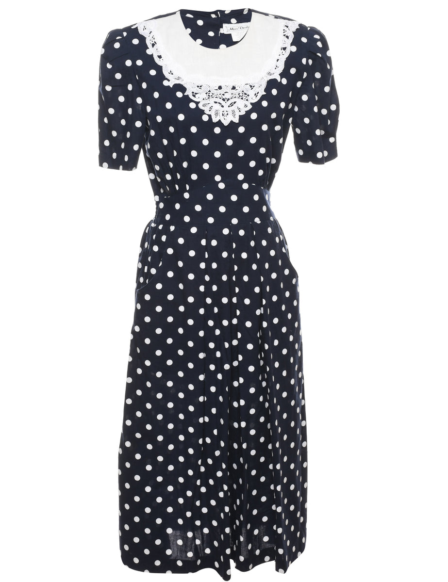 Polka dot navy dress with removable shoulder pads and lace trim.