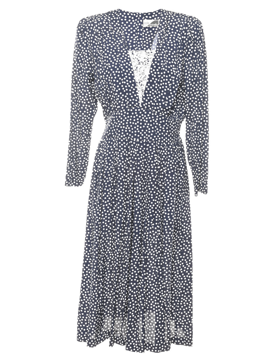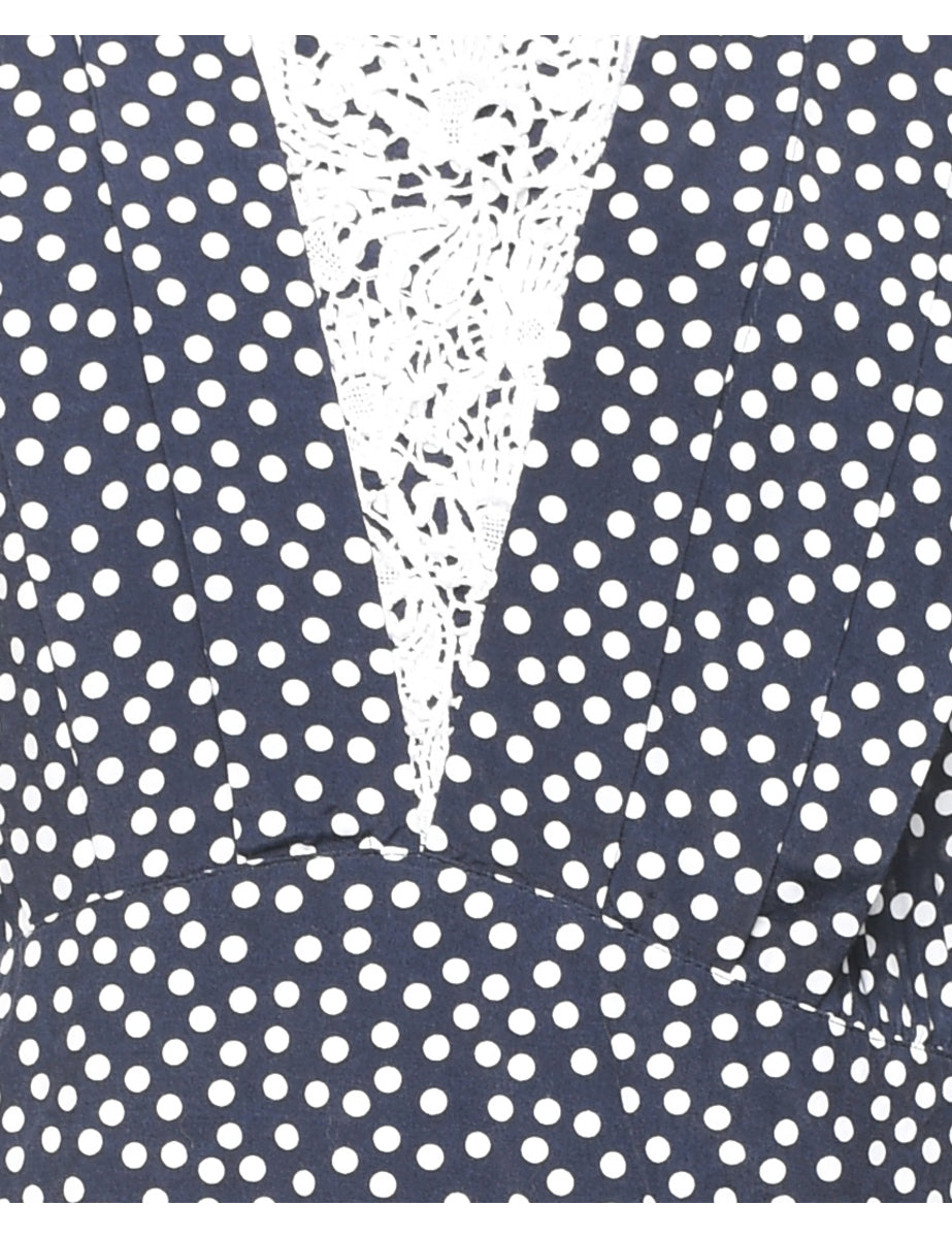 Polka dots dress in navy with long sleeves and lace trim.