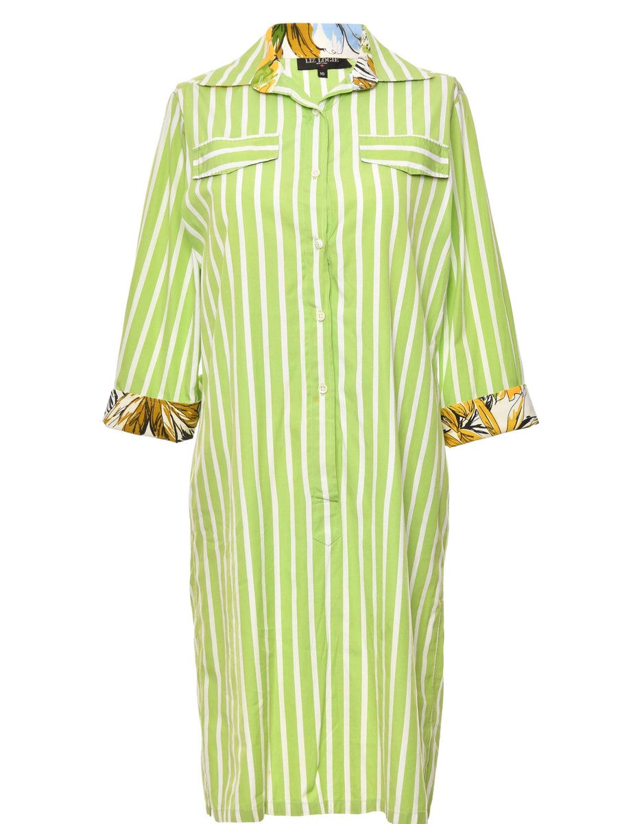 Striped green & off-white dress complete with multiple pockets and contrasting trim.
