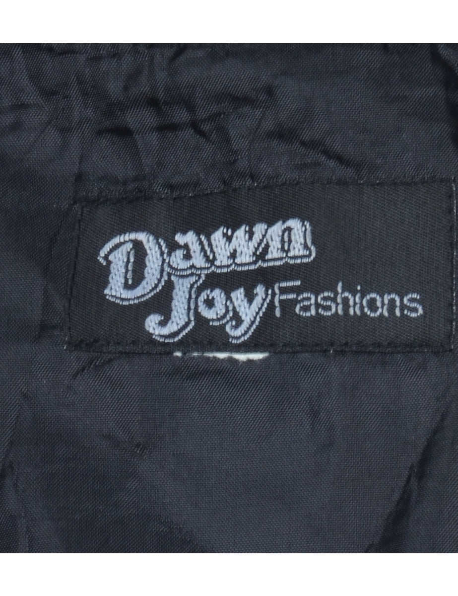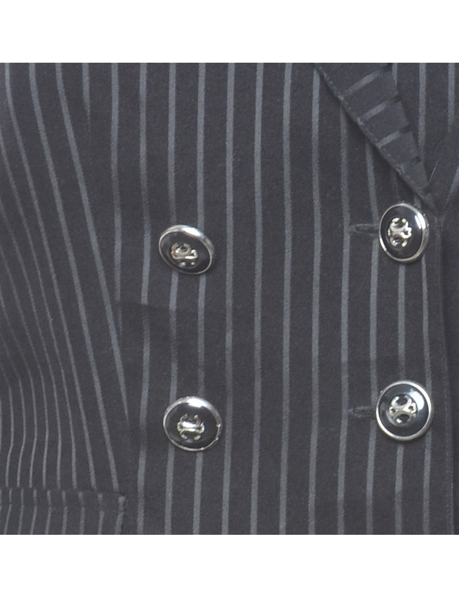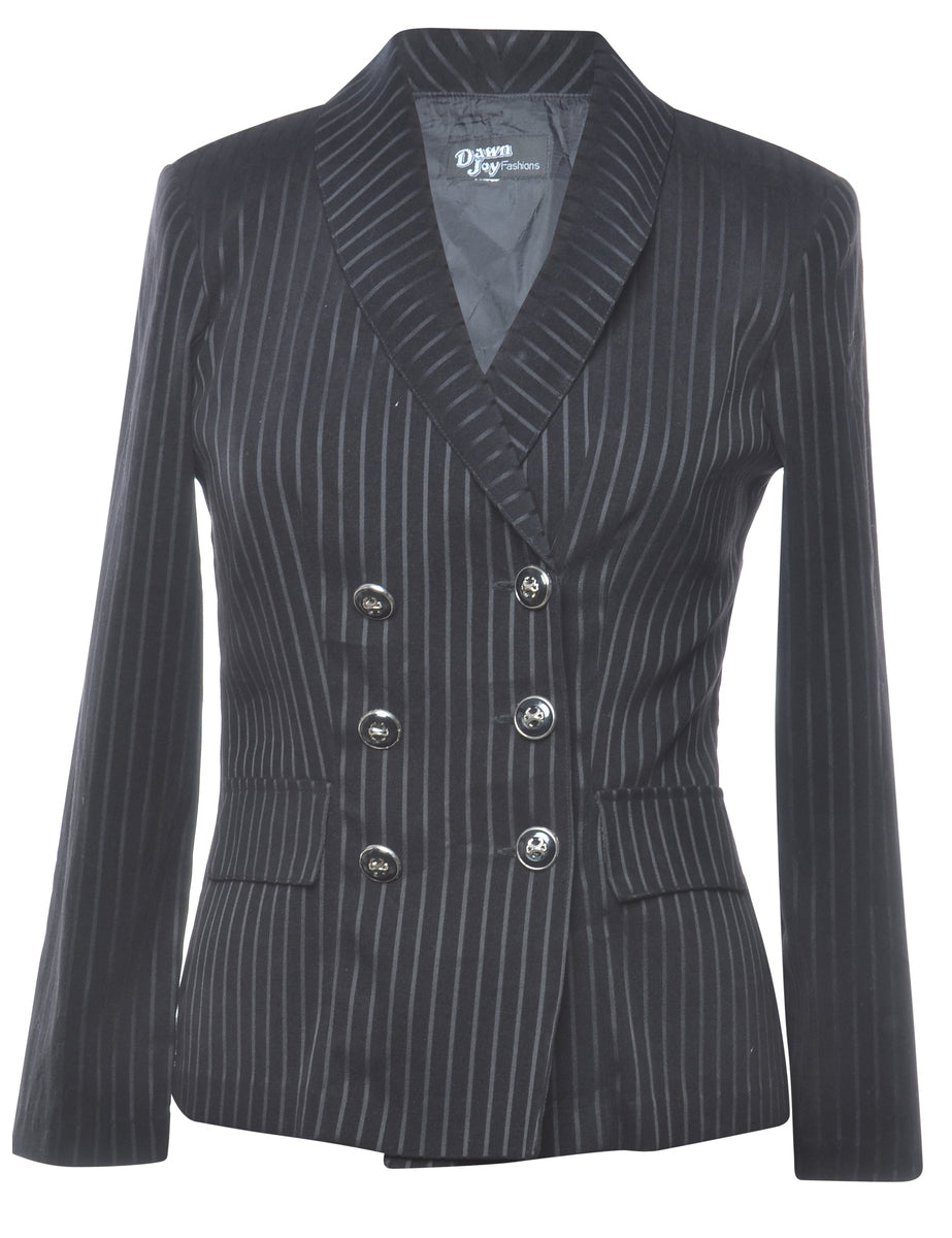 Dawn Joy double breasted blazer with striped pattern. Comes in black with a shawl collar and built in shoulder pads.