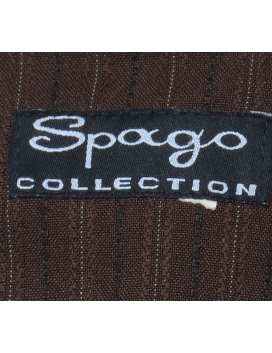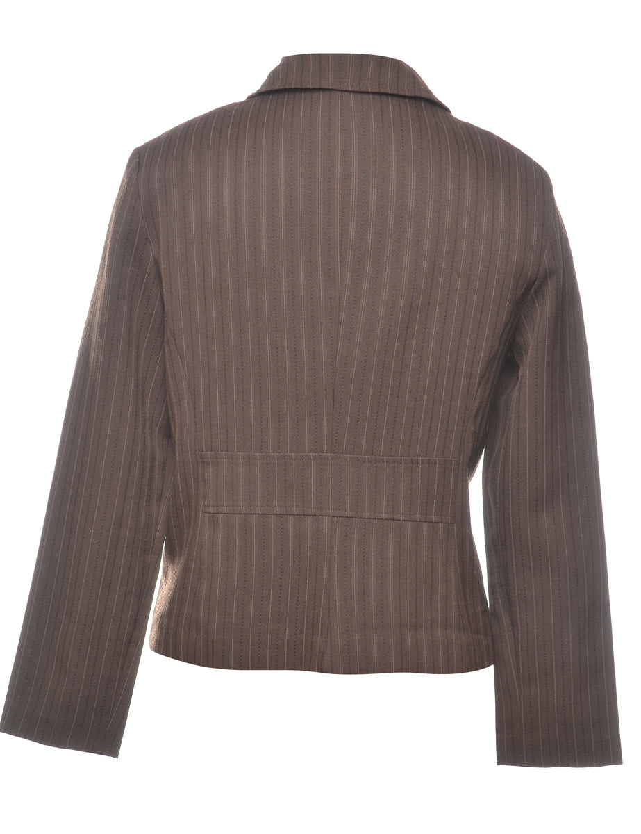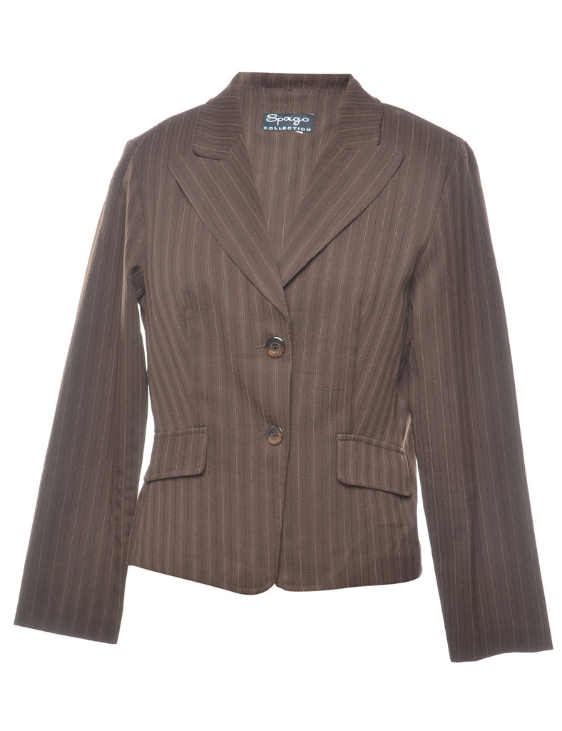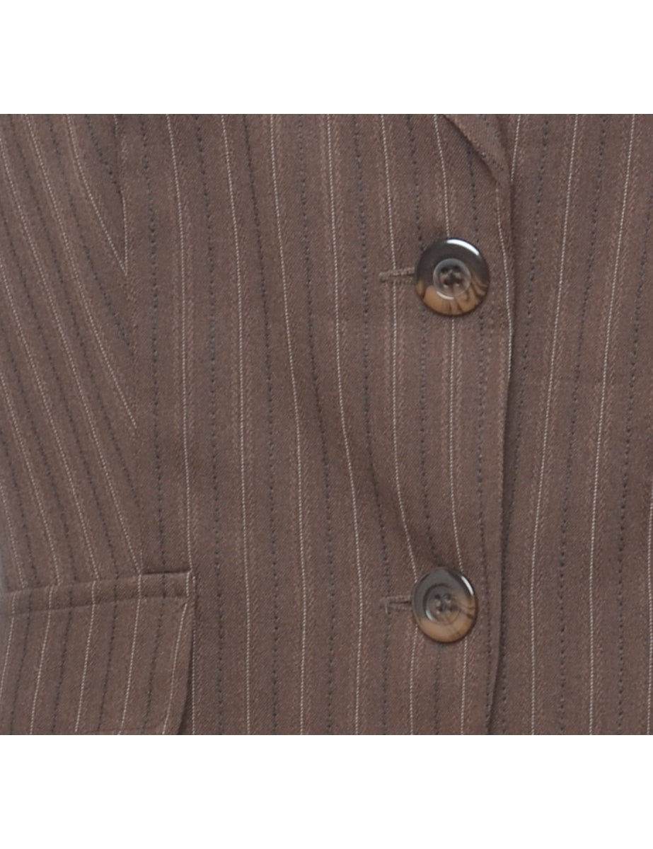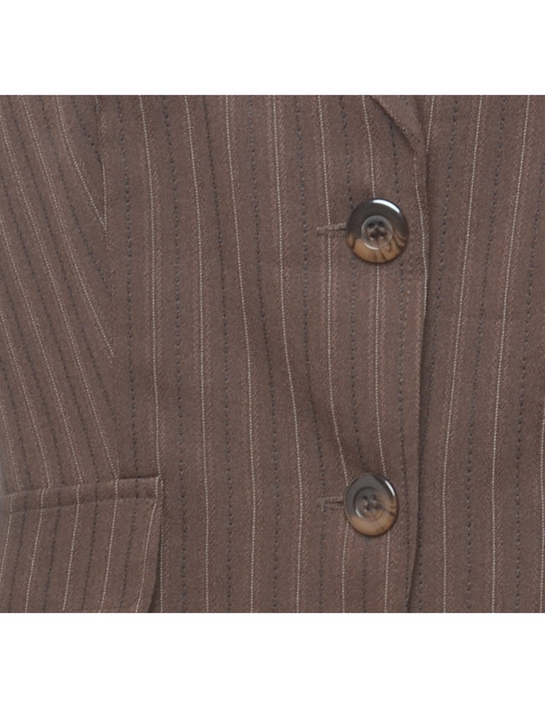 Button front blazer with striped pattern. Comes in dark brown with decorative pockets and removable shoulder pads.