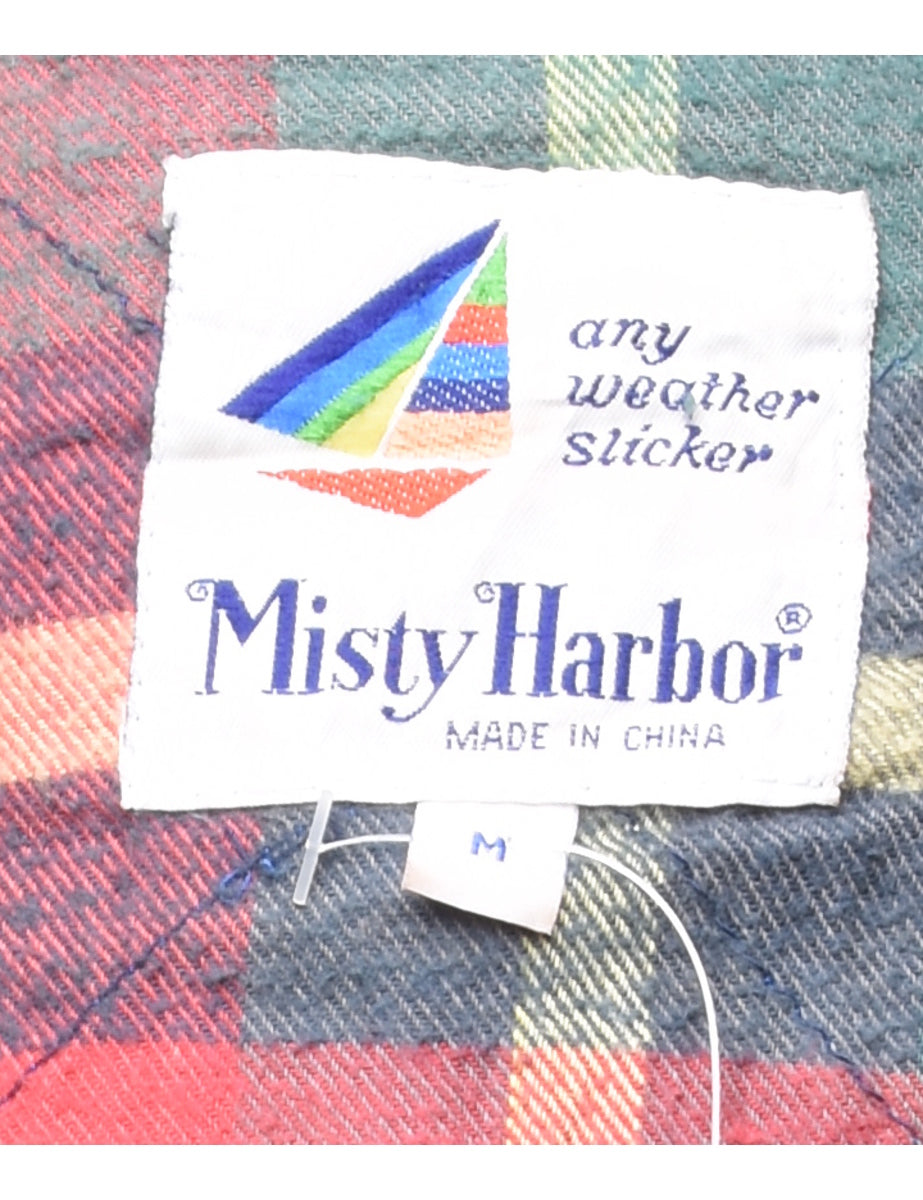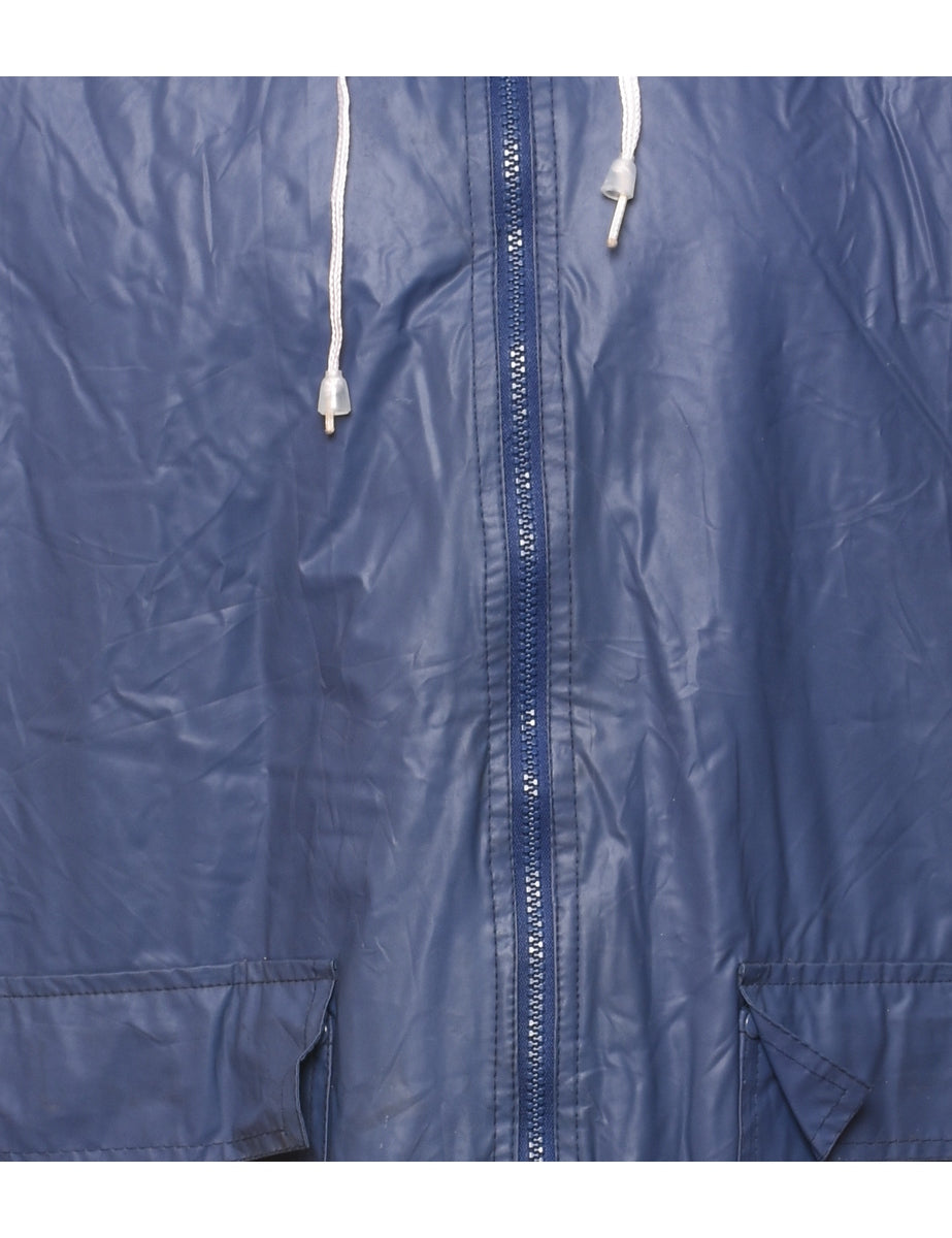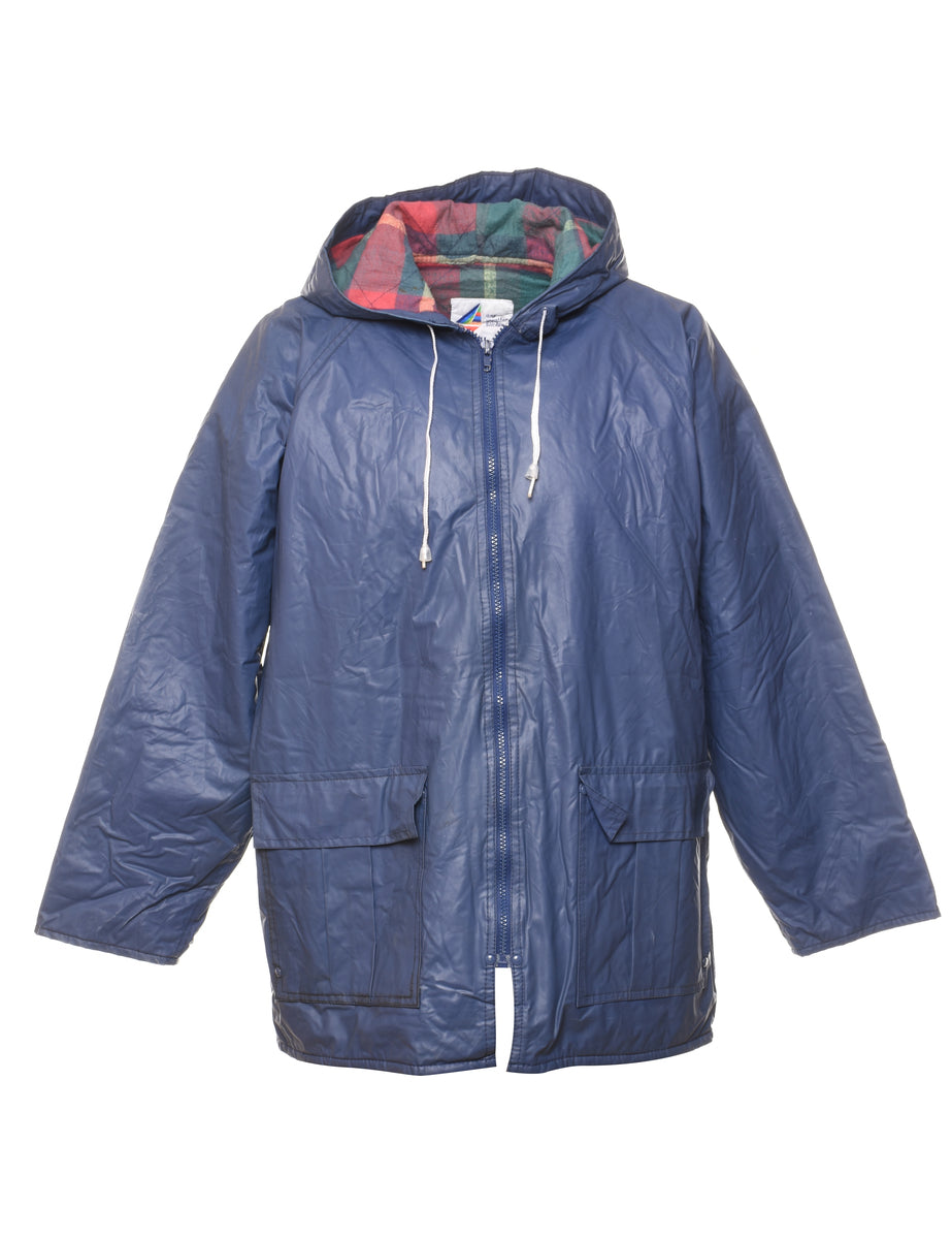 Navy zip-front raincoat complete with a hood, tartan lining and multiple pockets.