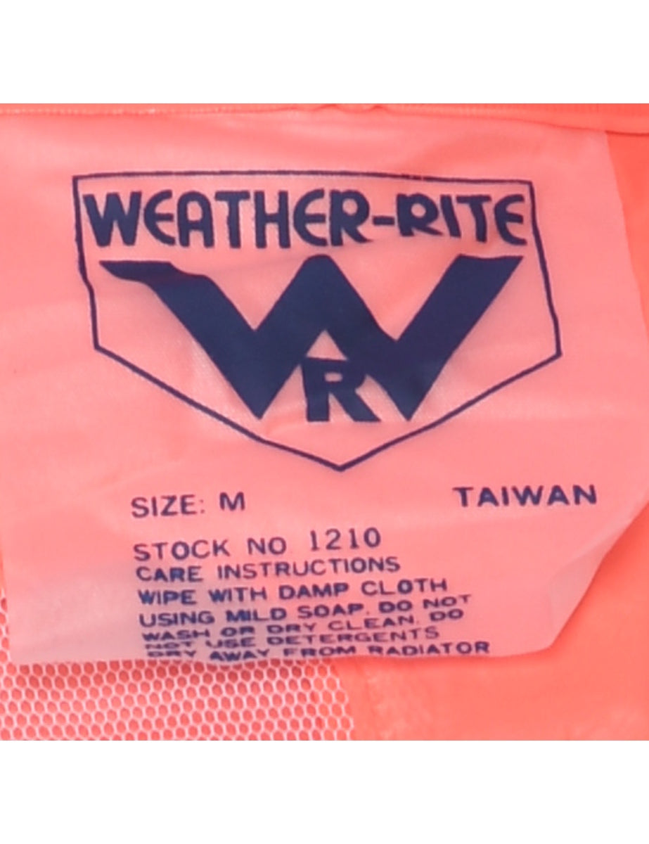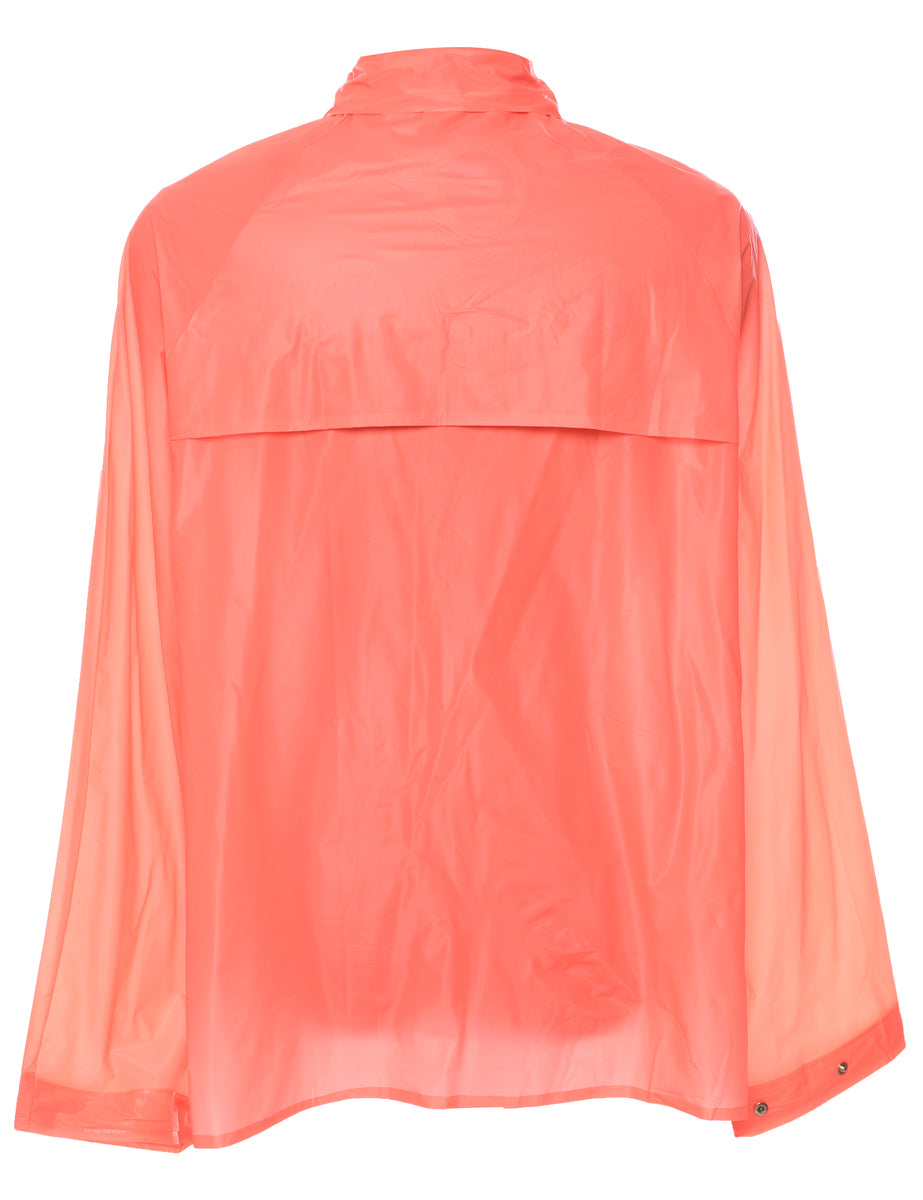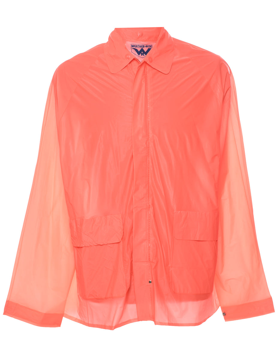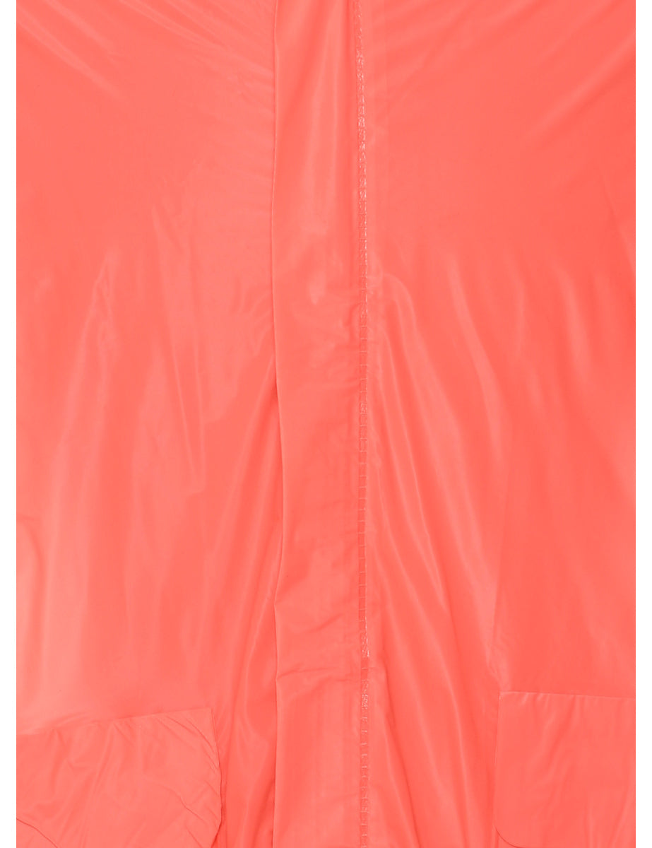 Zip front raincoat comes in orange with multiple pockets and raglan sleeves.