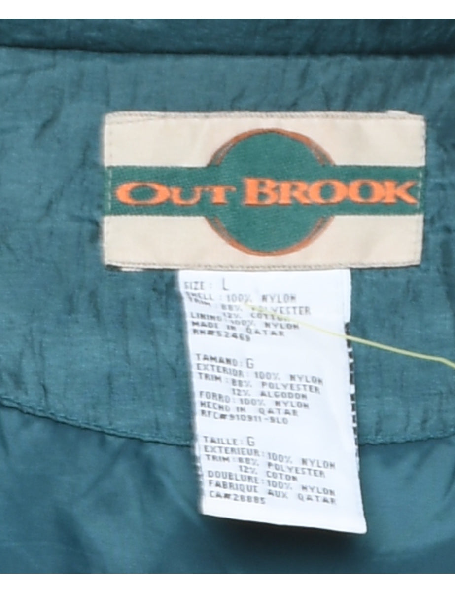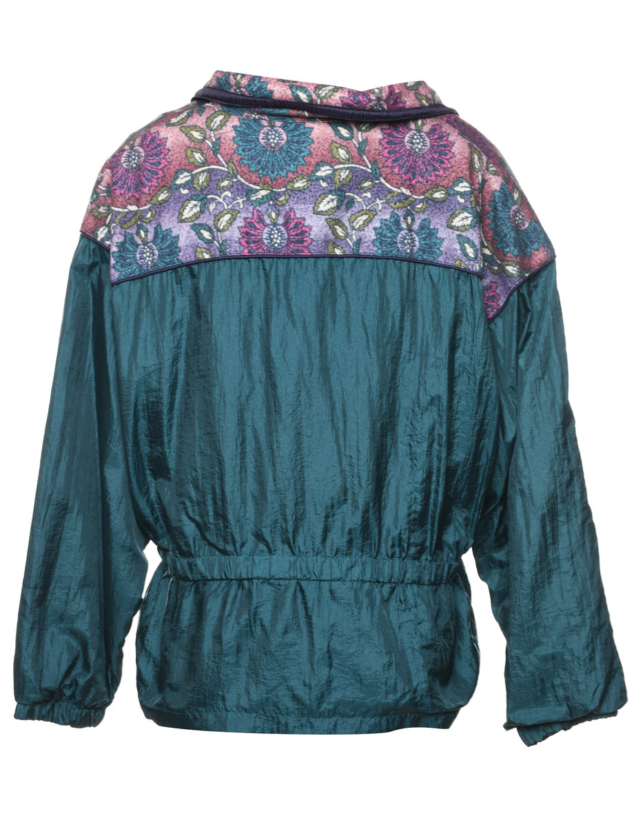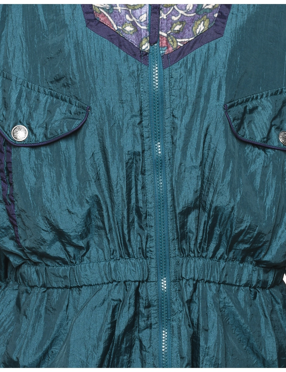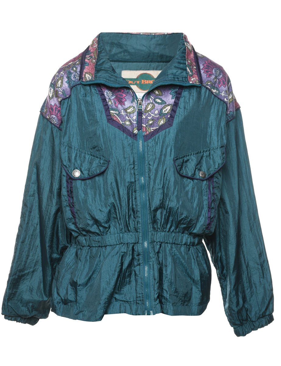 Zip front nylon jacket in dark green with full lining and multiple pockets.