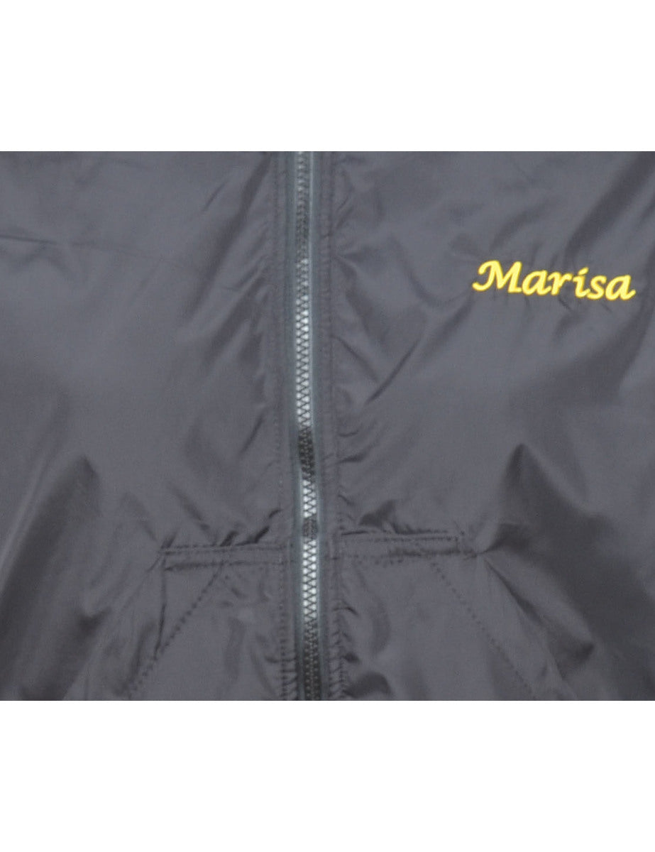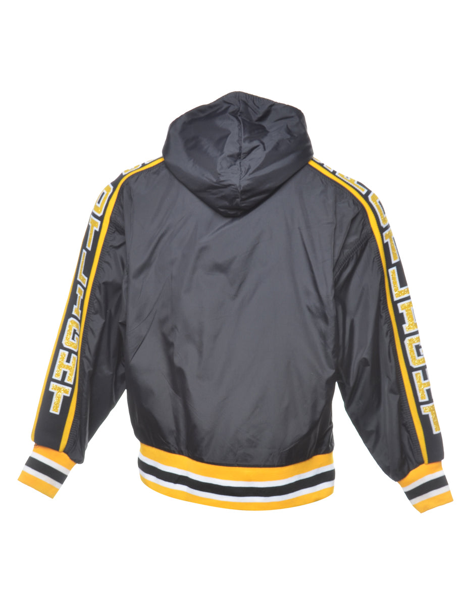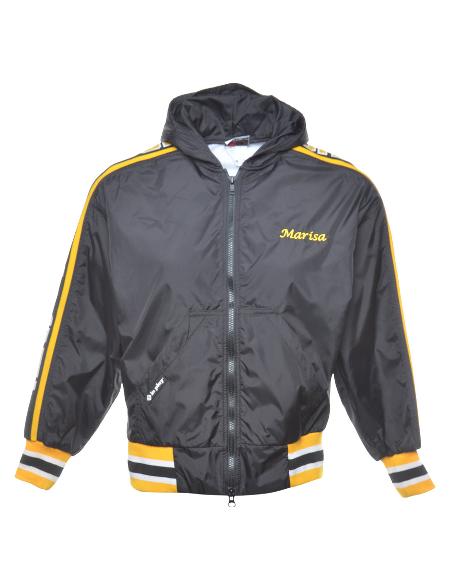 Hooded bomber jacket. Comes in black with full lining and ribbed cuffs and waistband.