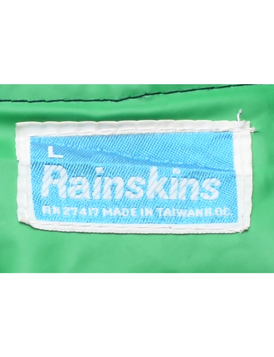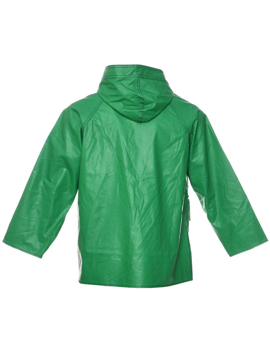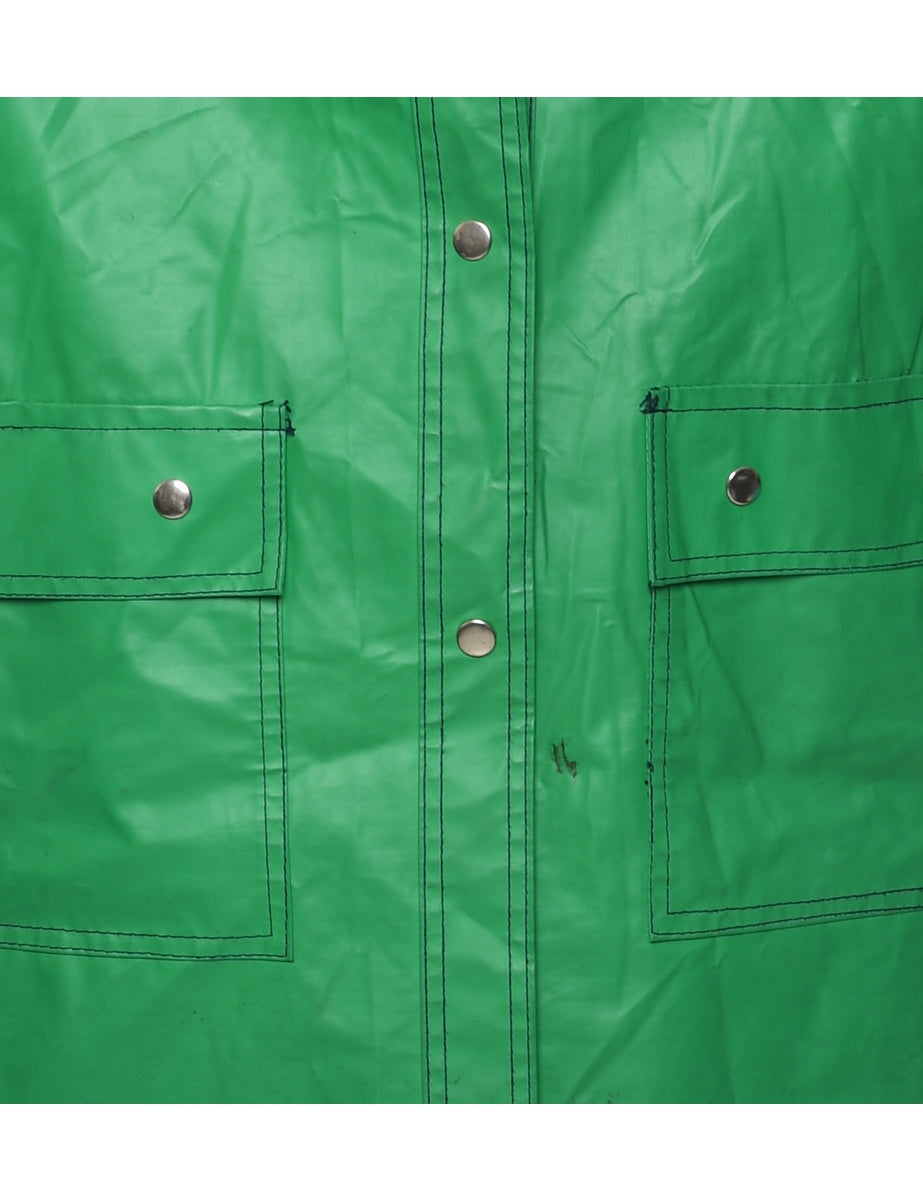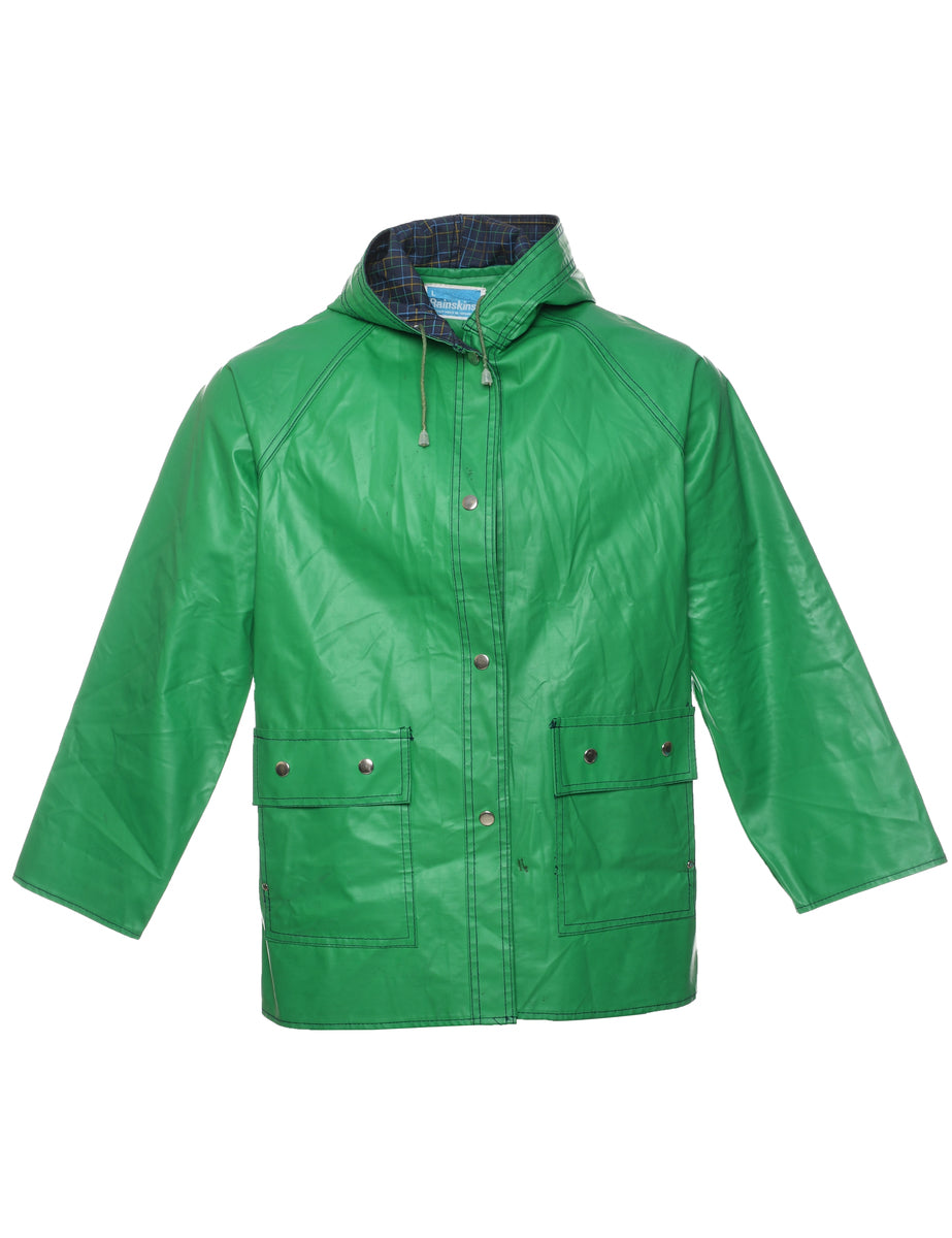 Hooded raincoat in green with multiple pockets and raglan sleeves.
