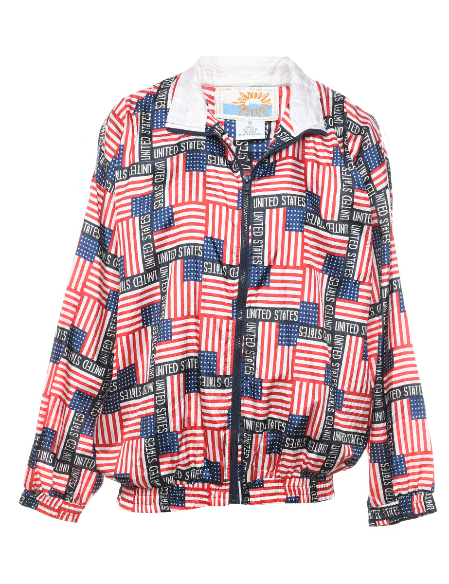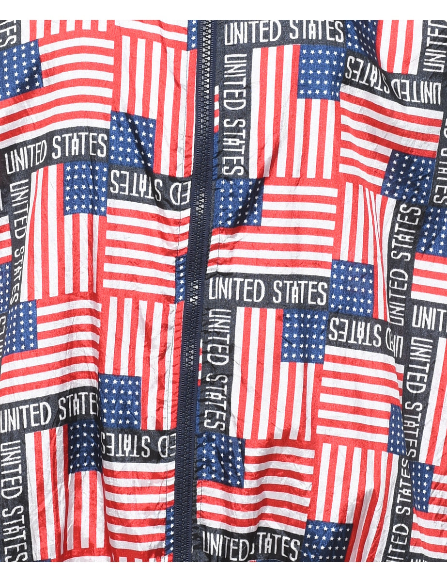 Red & blue USA flag design nylon jacket complete with front zipper.