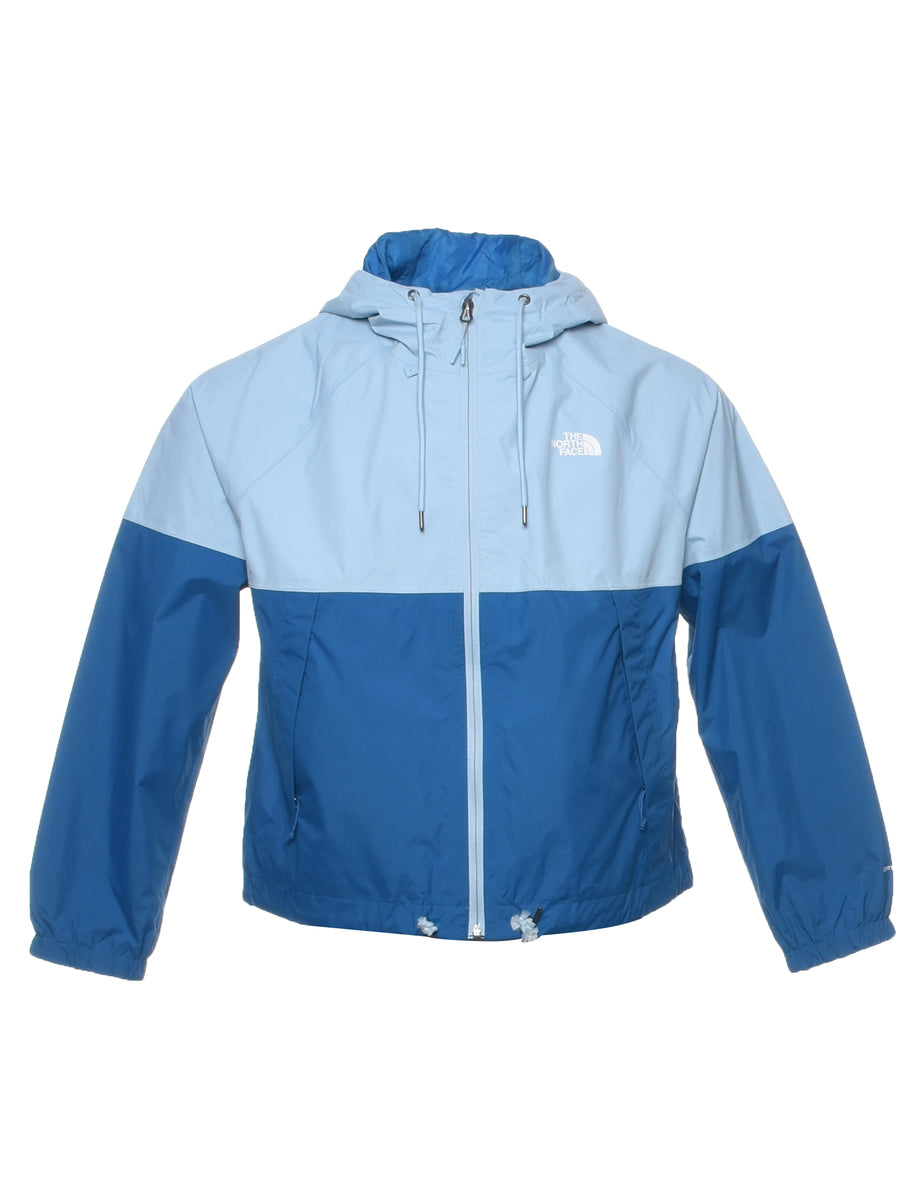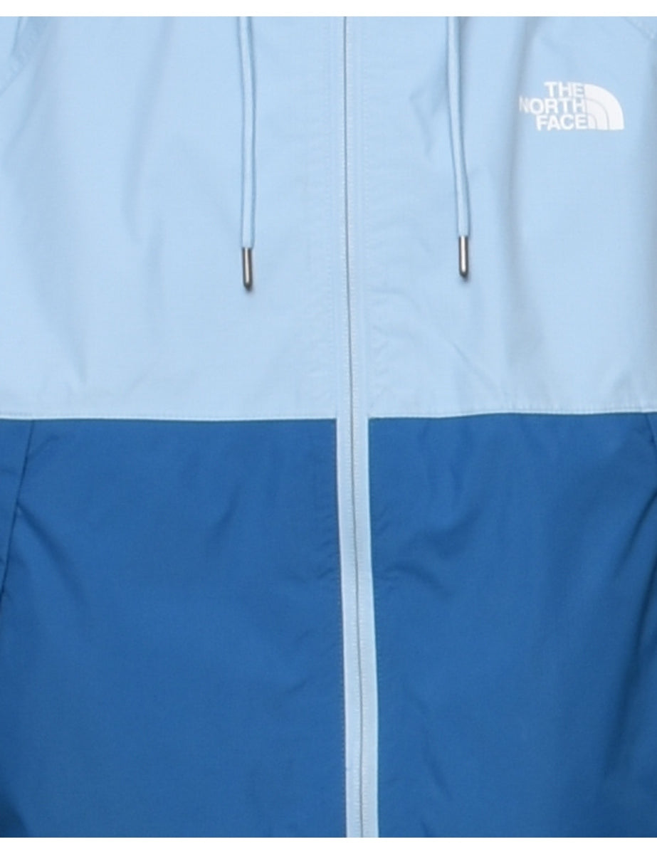 Hooded nylon jacket. Comes in light blue & teal with multiple pockets and raglan sleeves.