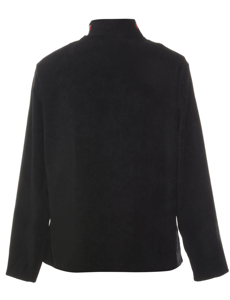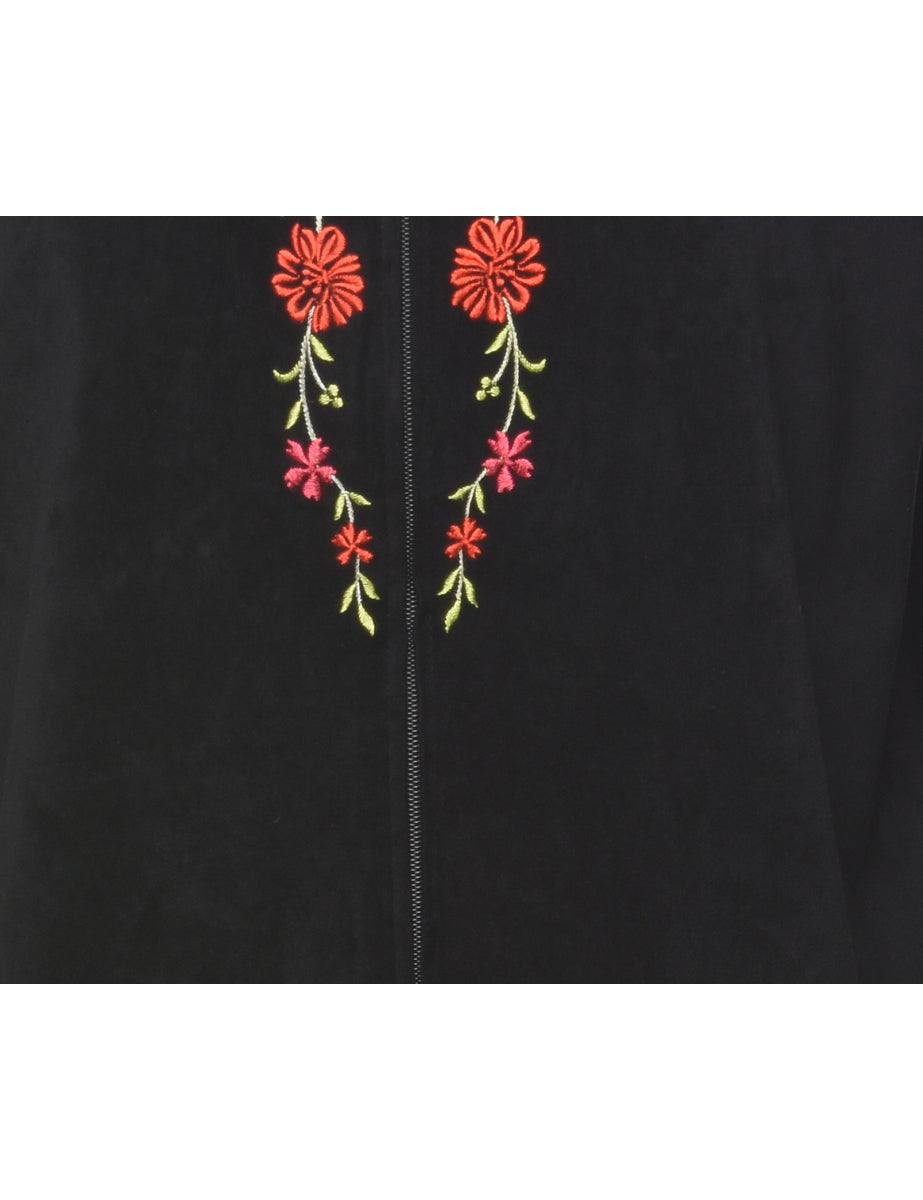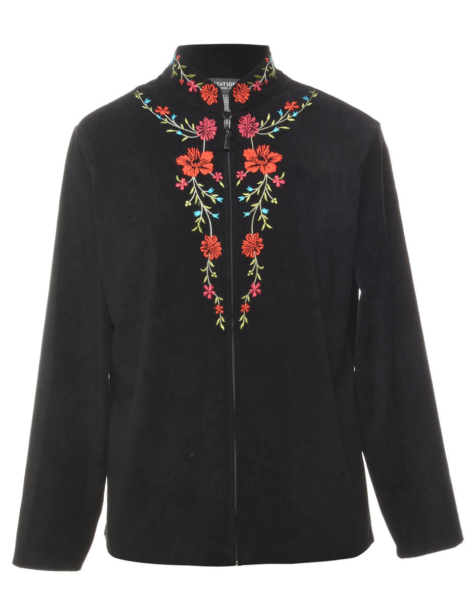 Zip front jacket in black with embroidery.