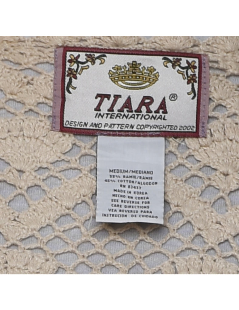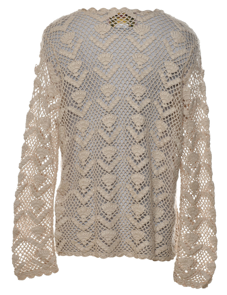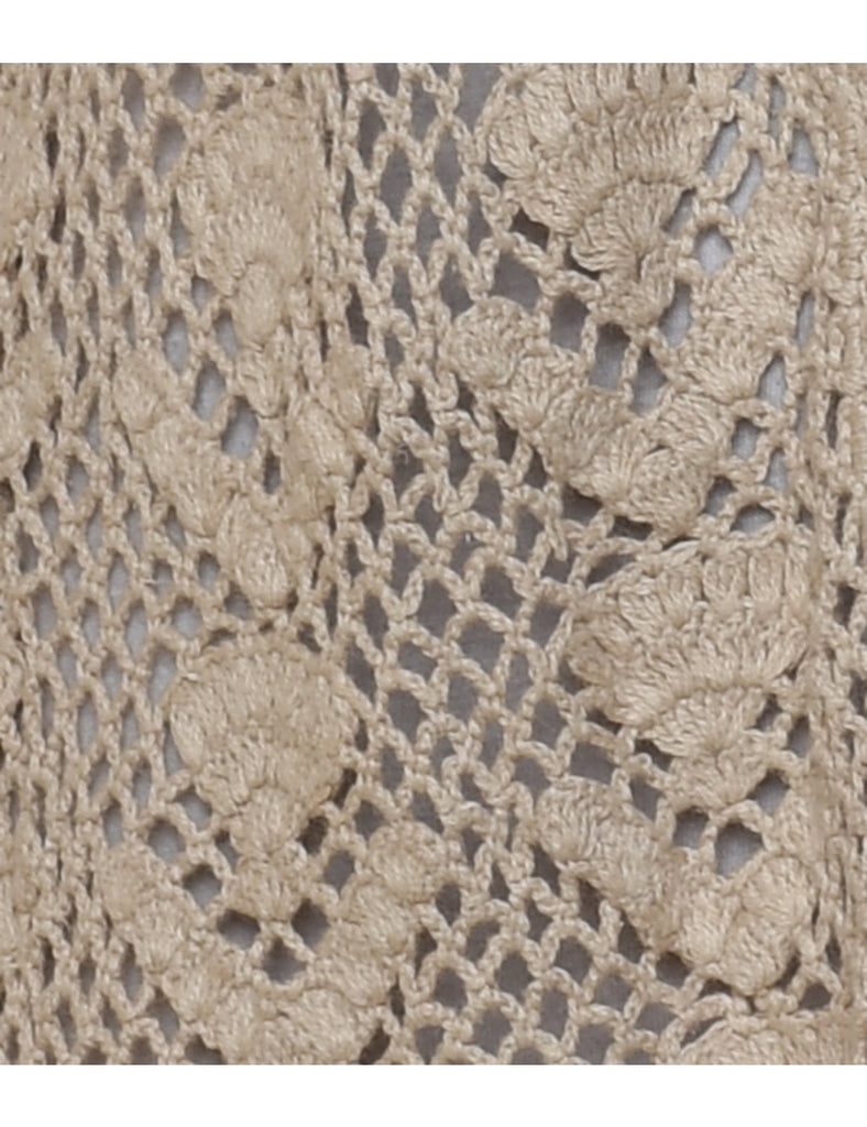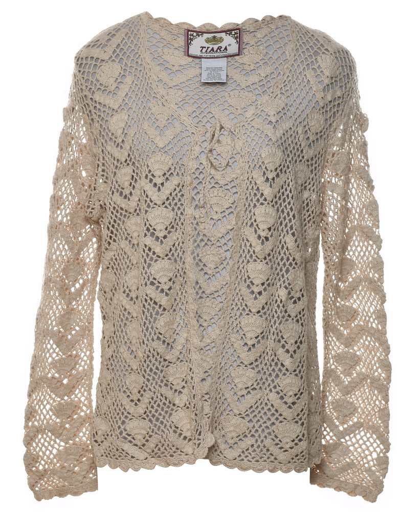 Classic cardigan with crochet. Comes in beige with a scalloped hem.