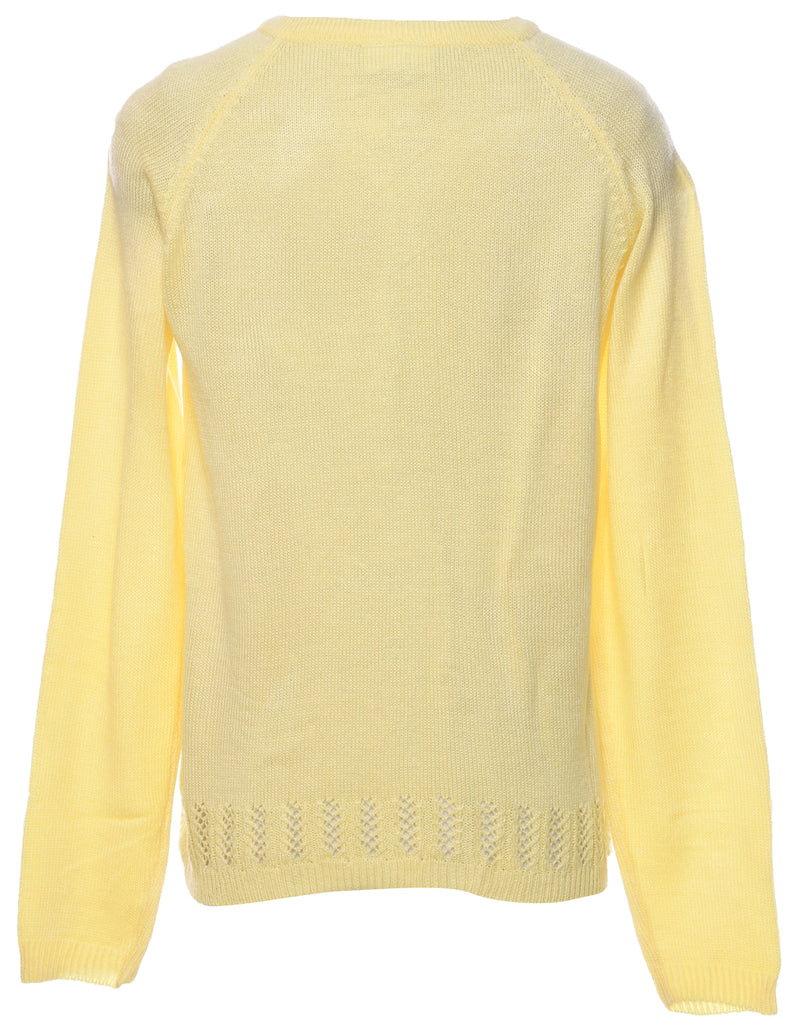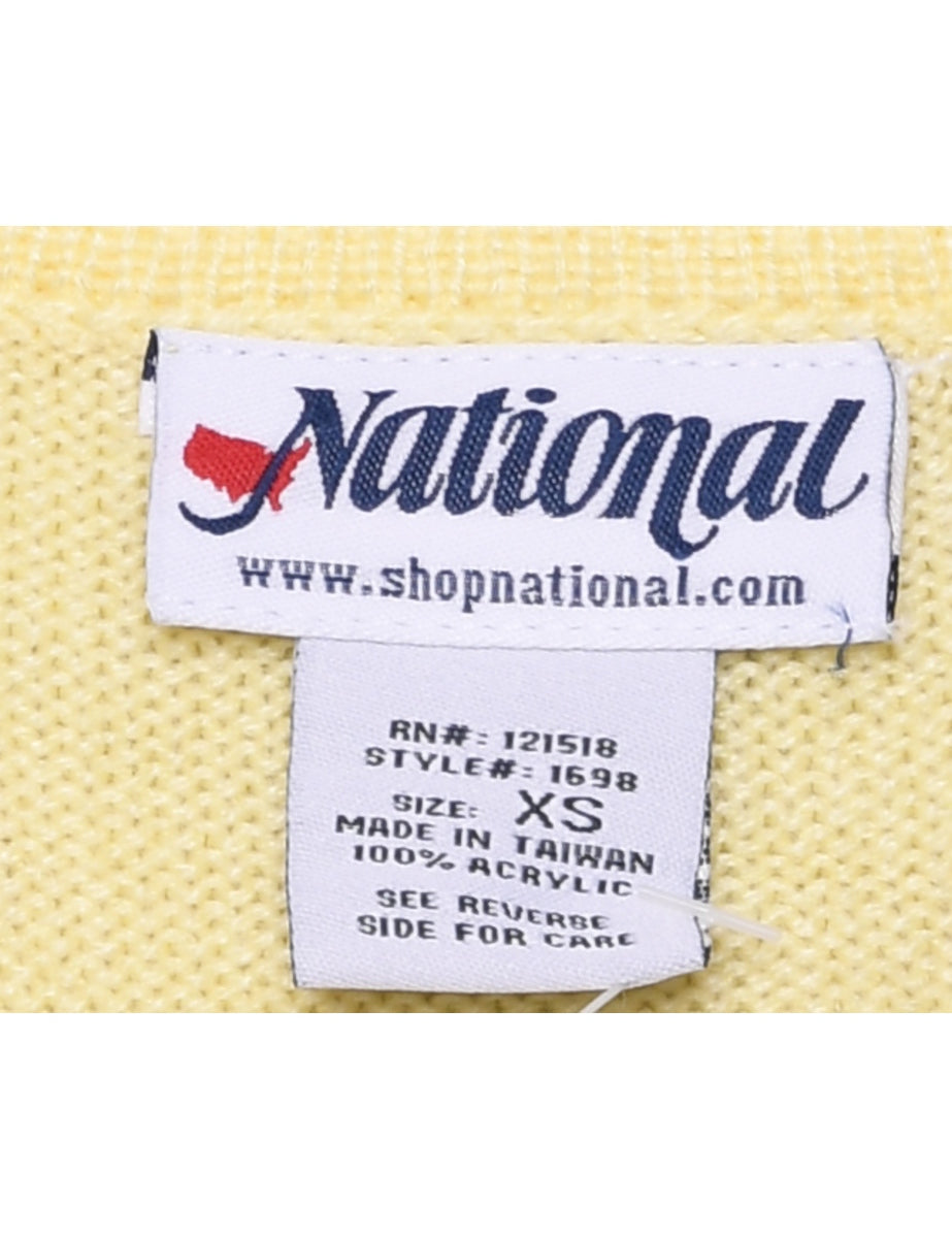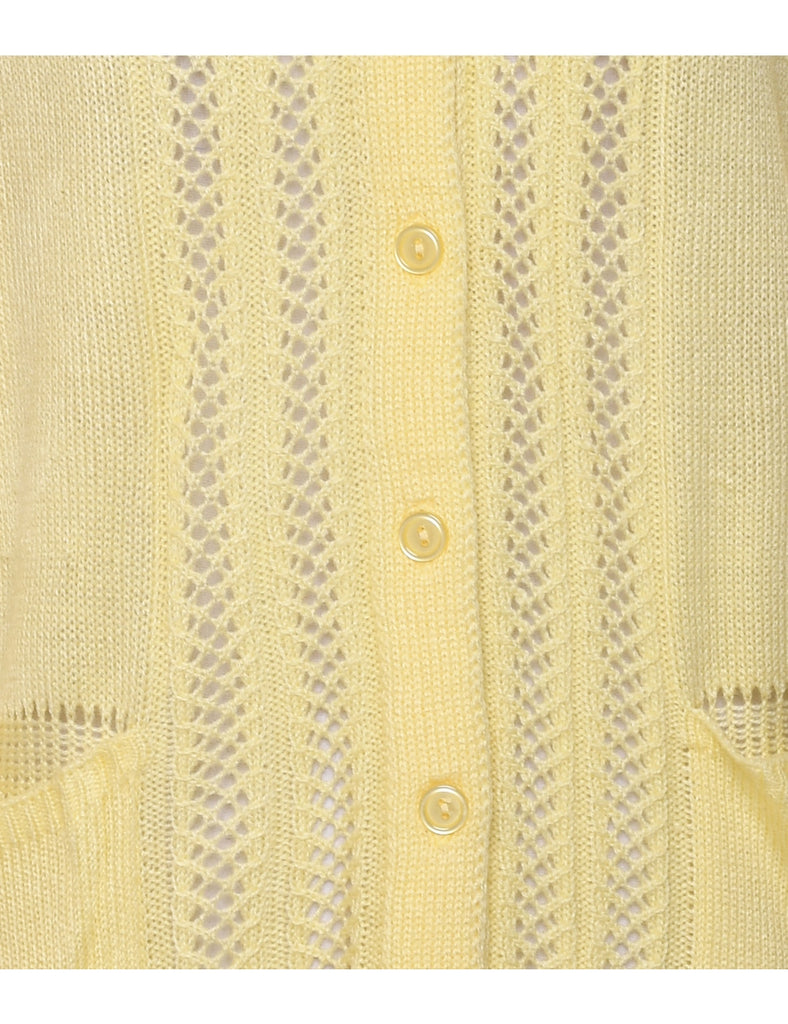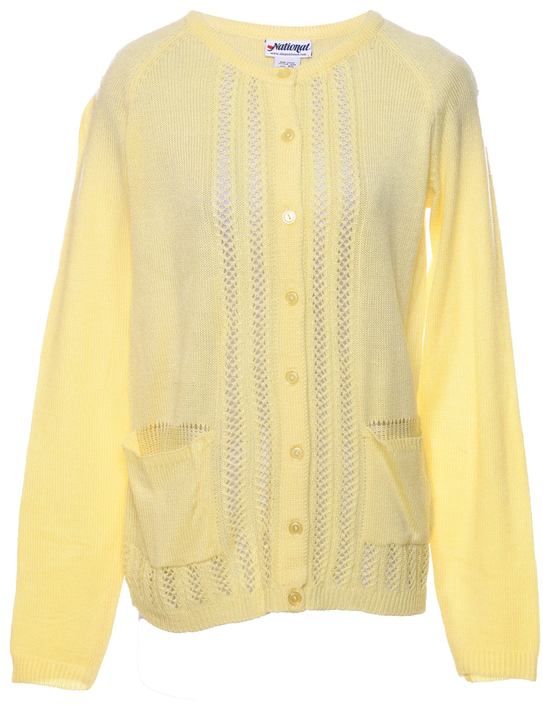 Button through cardigan in pale yellow with a round neck and multiple pockets.