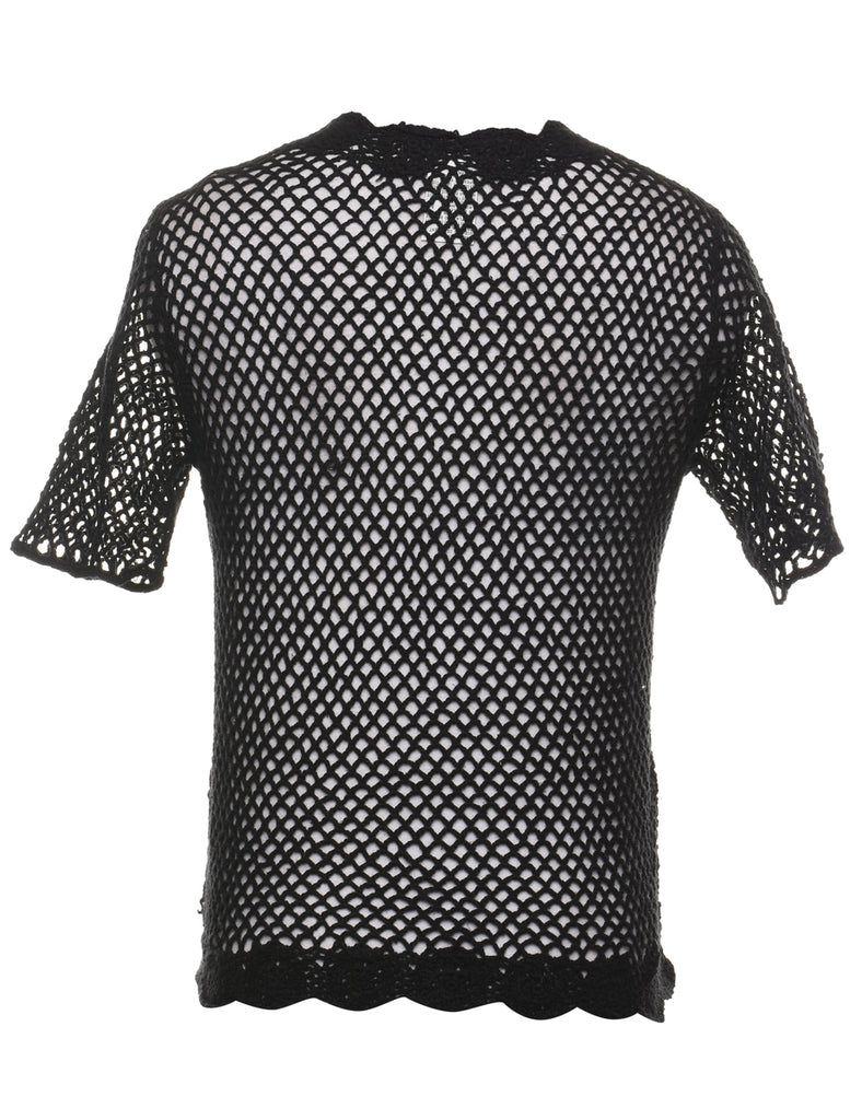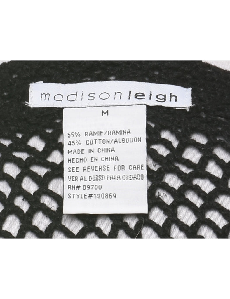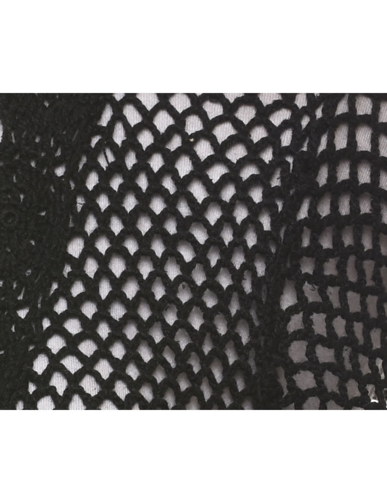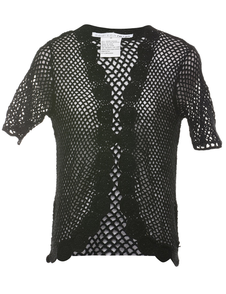 Cardigan with crochet. Comes in black with a scalloped hem.