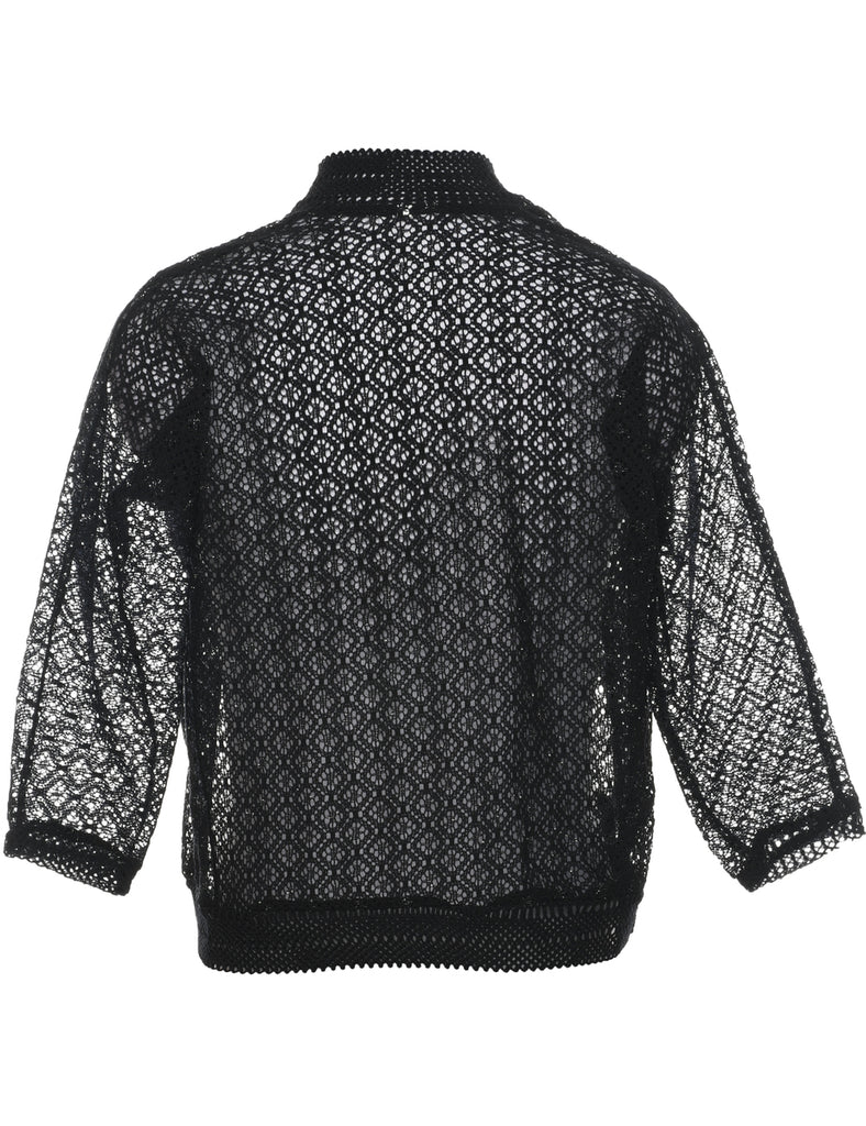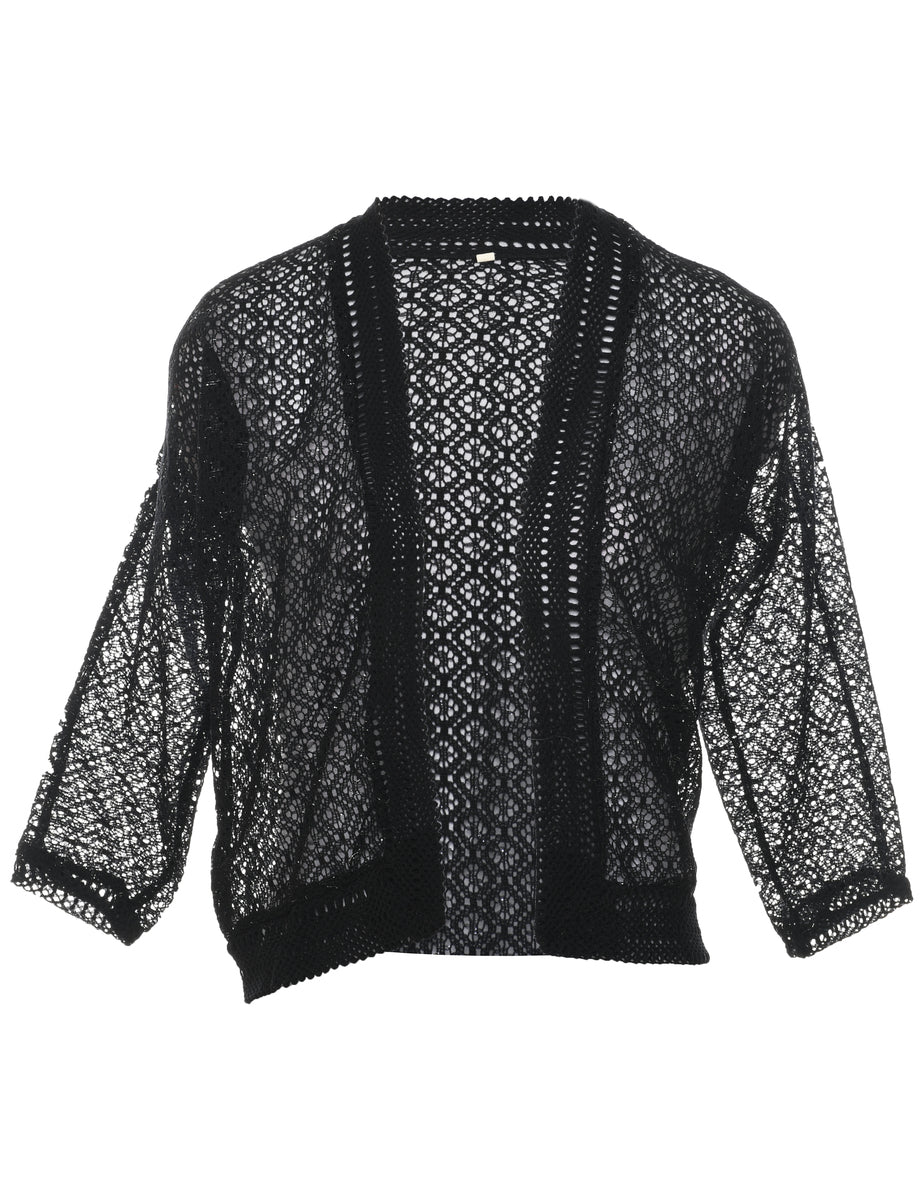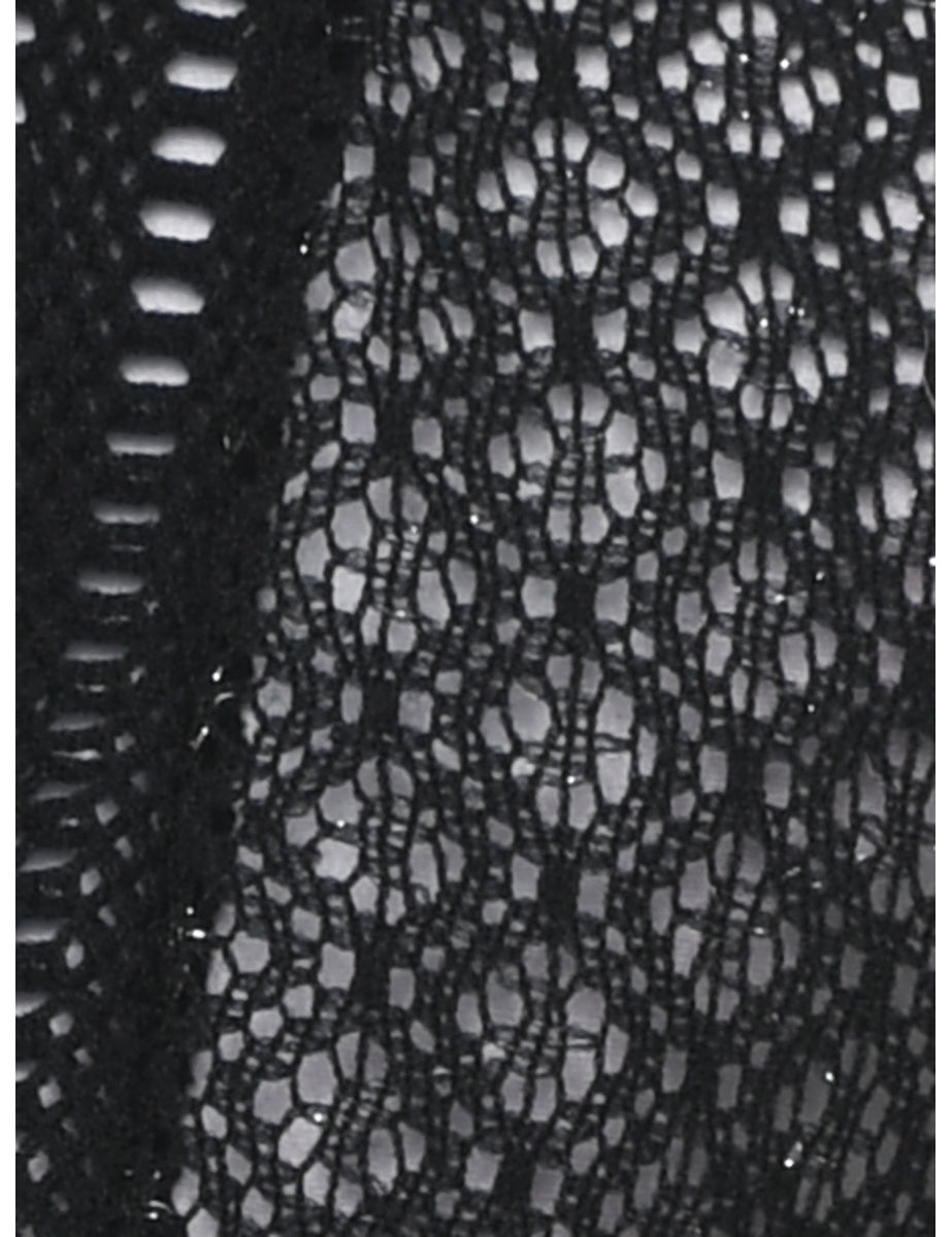 Lurex thread pattern cardigan with crochet comes in black with lace trim.