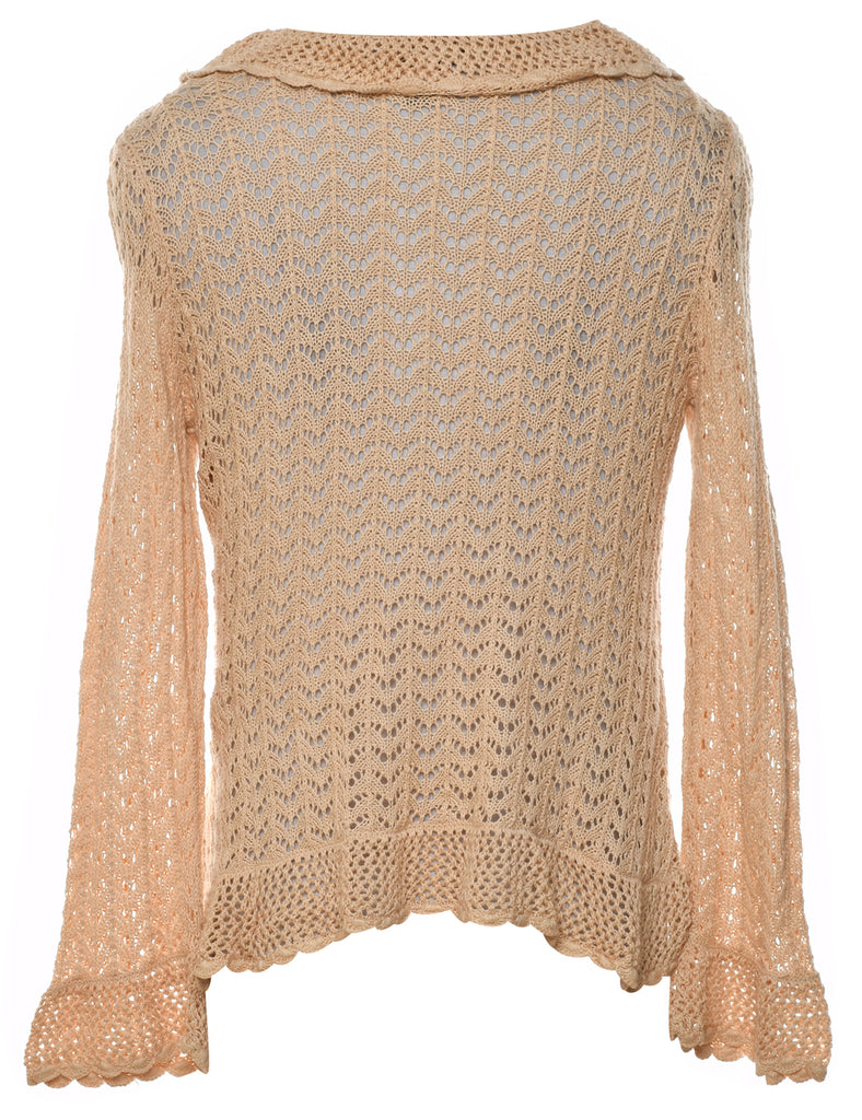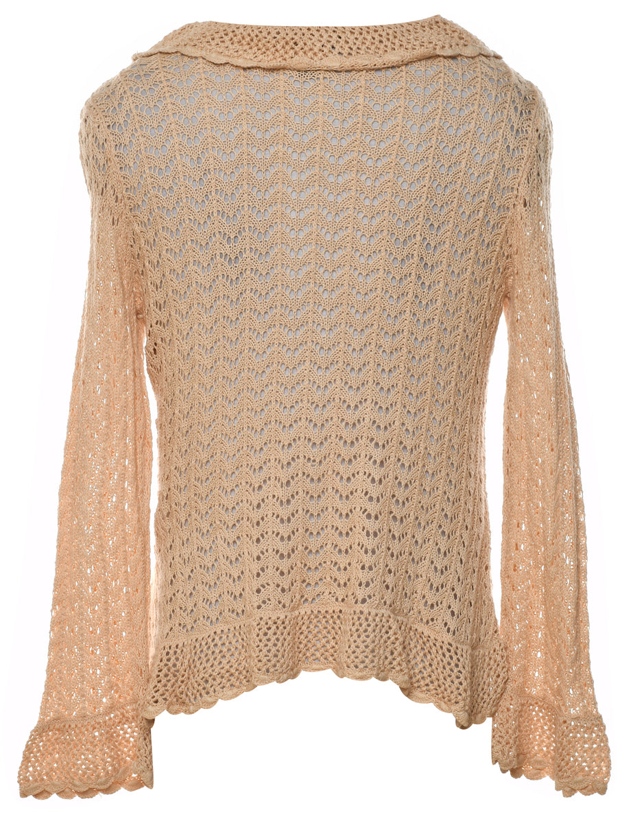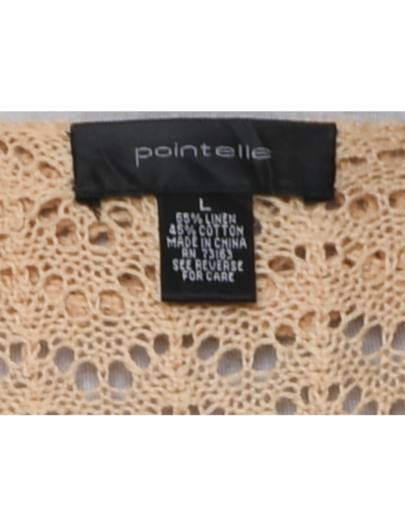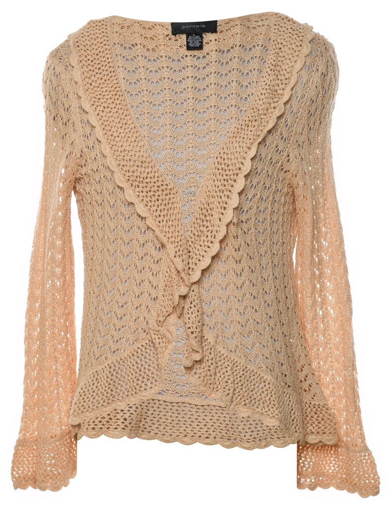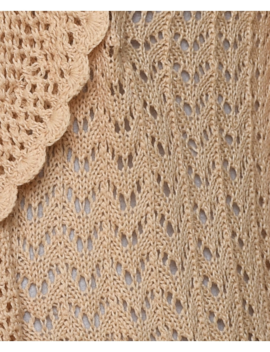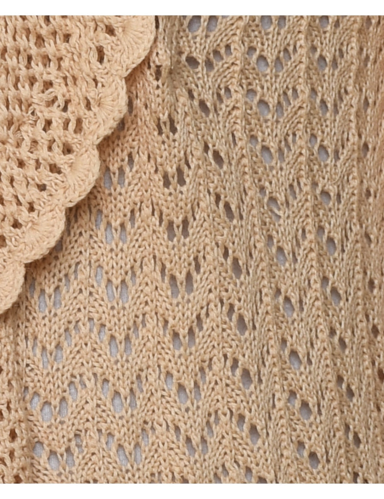 Cardigan with crochet. Comes in light brown with a scalloped hem.
