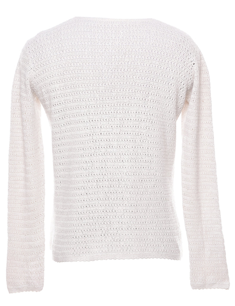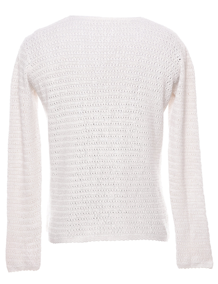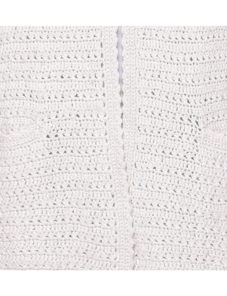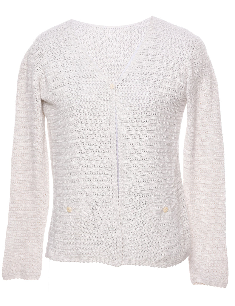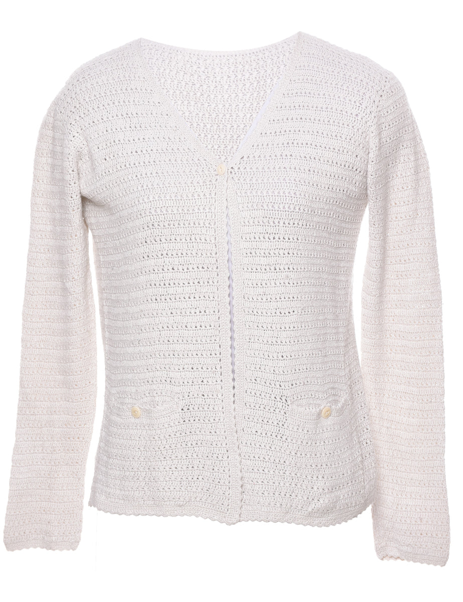 Button through cardigan with crochet. Comes in off white with a scalloped hem.