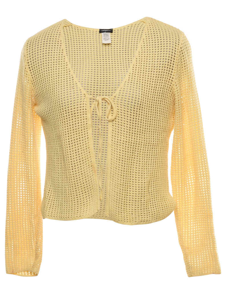 Pale yellow crochet cardigan with tie feature.
